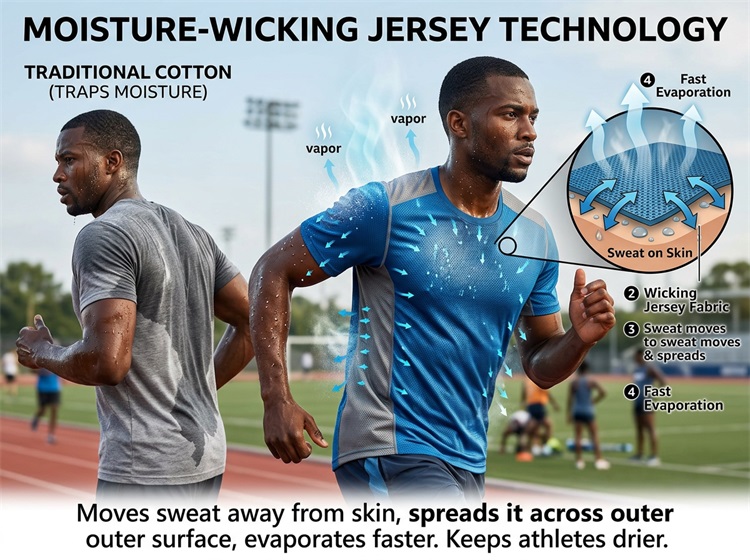 Moisture-wicking jersey technology refers to fabric engineering that moves sweat away from the skin and spreads it across the outer surface of the garment, where it can evaporate faster. Instead of trapping moisture like traditional cotton, modern jersey fabrics are designed to keep athletes drier during training and competition.