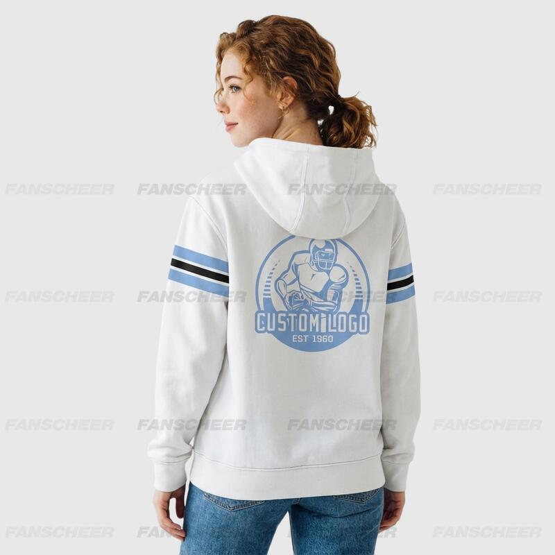Each fanscheer® tailored pullover sweatshirt hoodie is meticulously personalized with the following features: