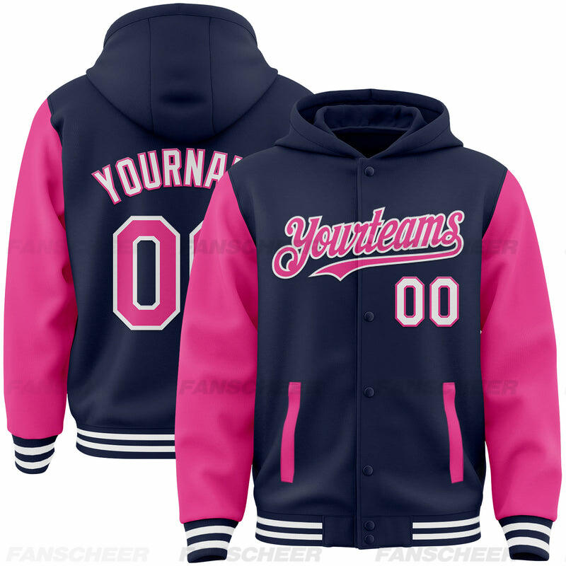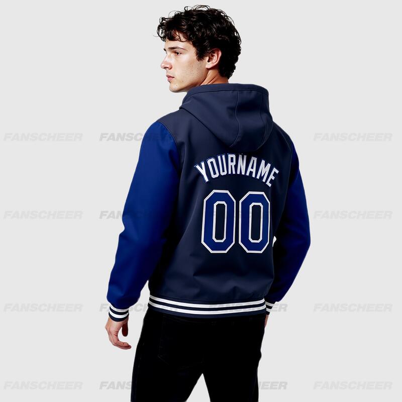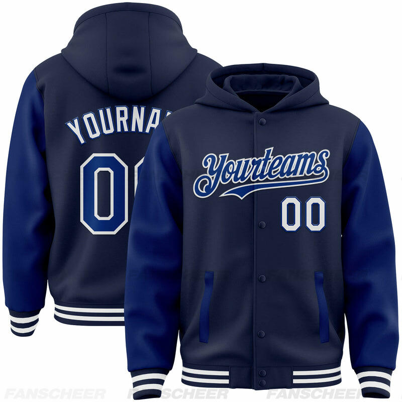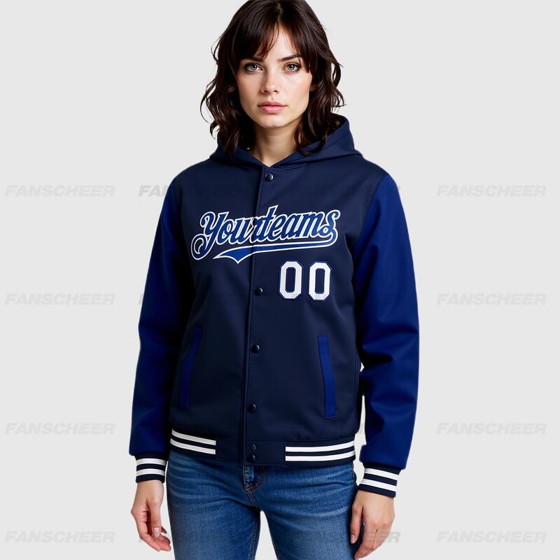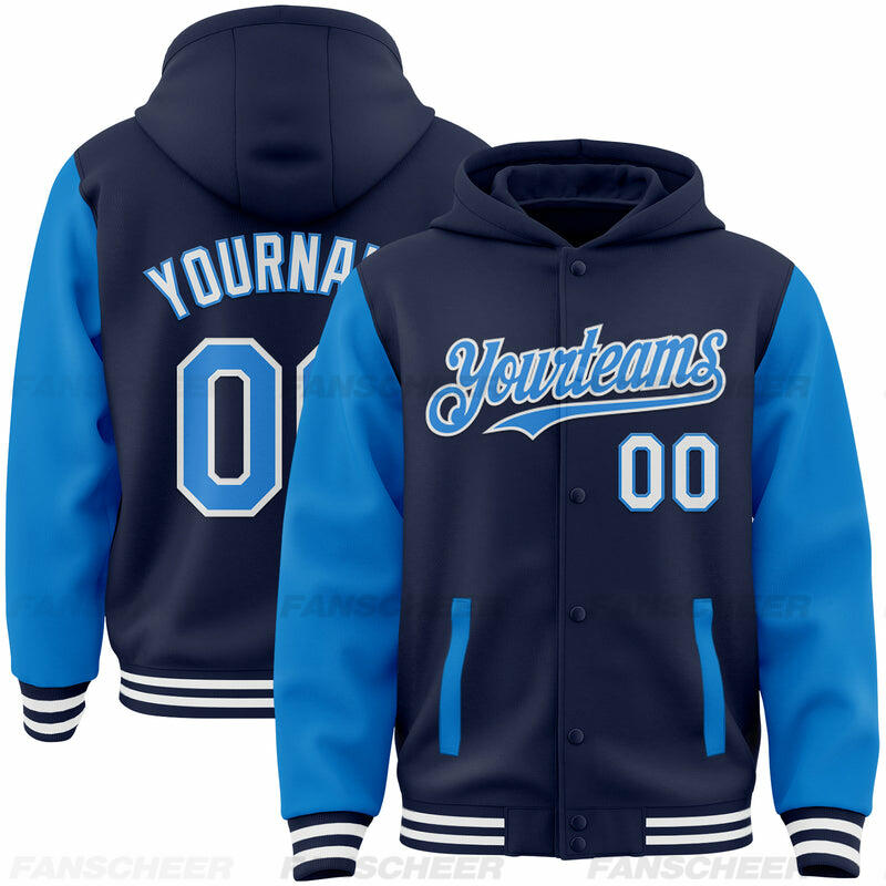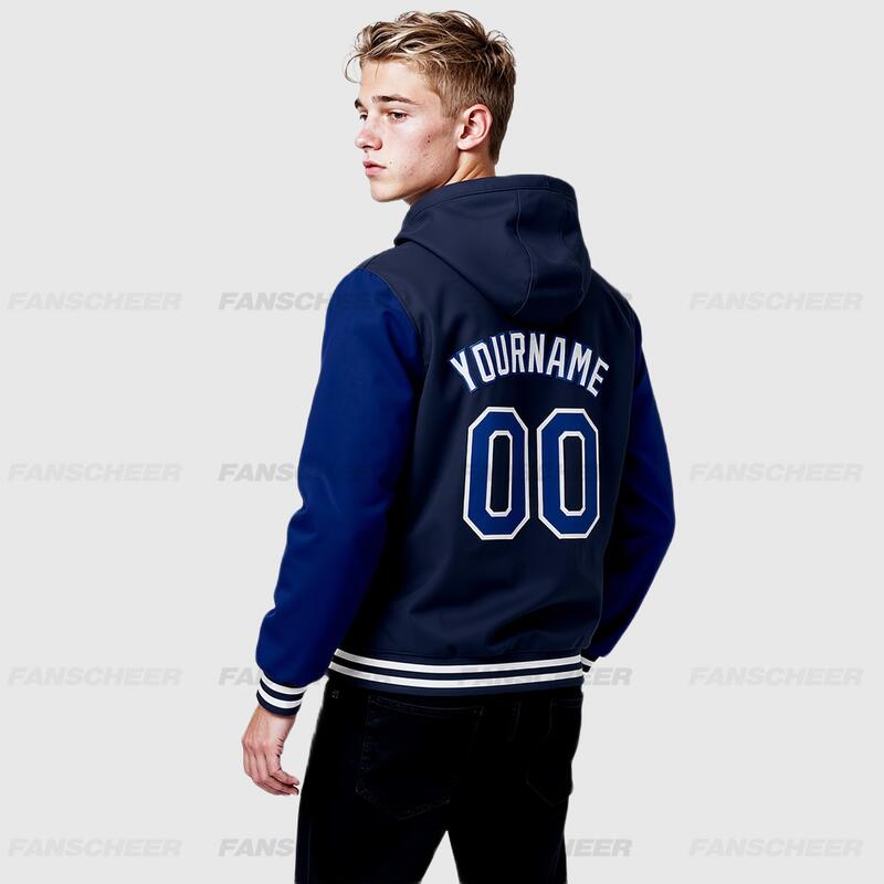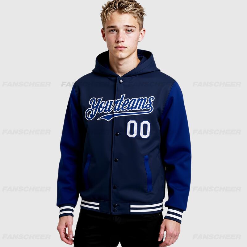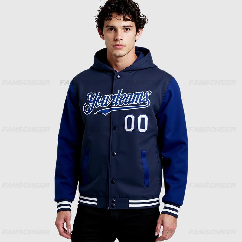 Custom Navy Blue Full-Snap Varsity Letterman Two Tone Hoodie Jacket for Campus Life