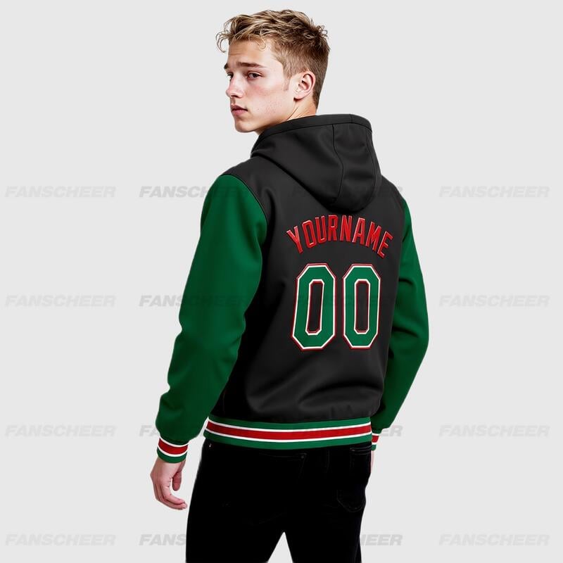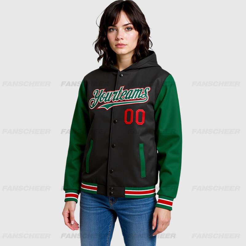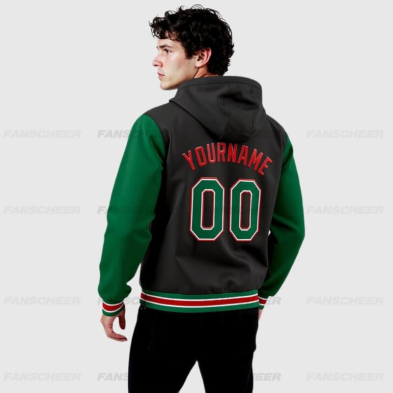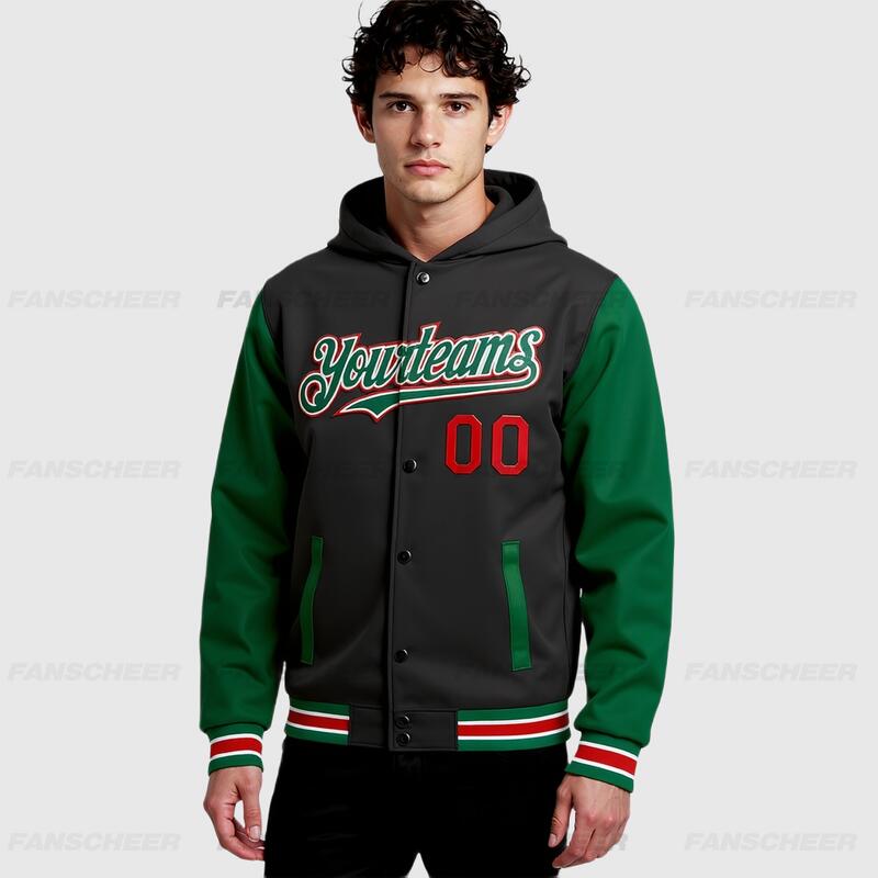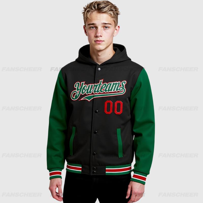 Custom Black Green Bomber Full-Snap Varsity Letterman Two Tone Hoodie Jacket for Campus Life