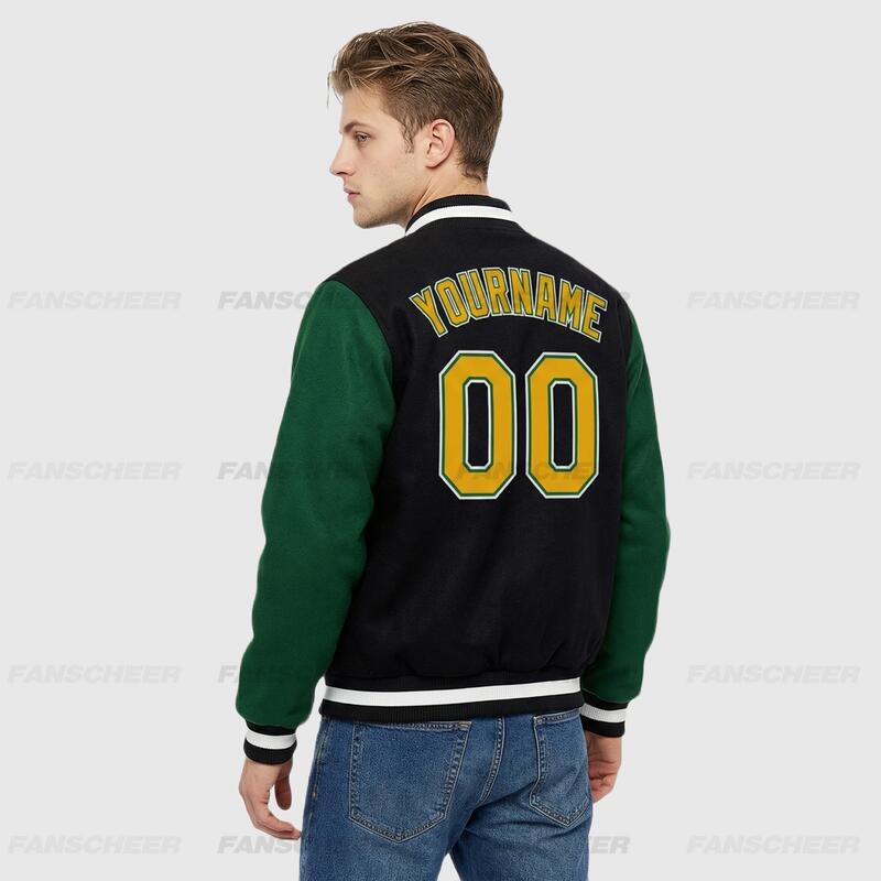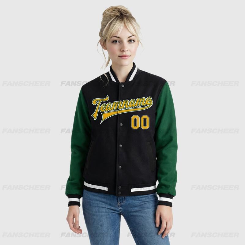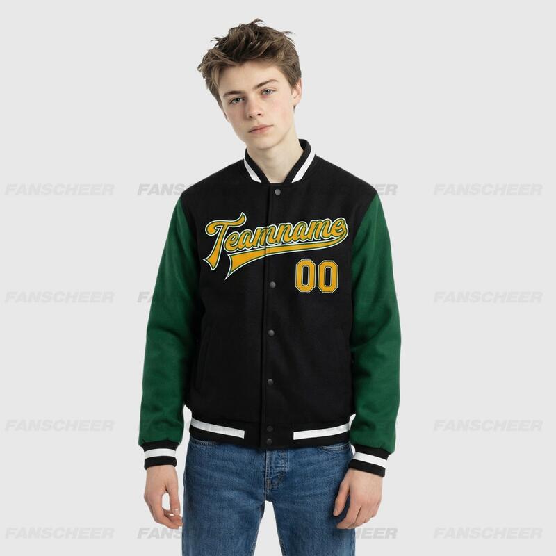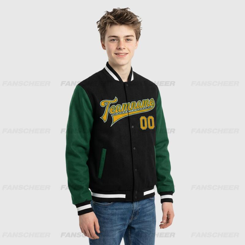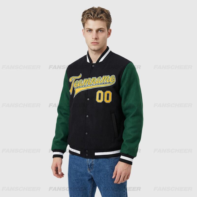 Custom Black-Green Two Tone Full-Snap Varsity Letterman Jacket – Great for Handicraft Pottery Classes