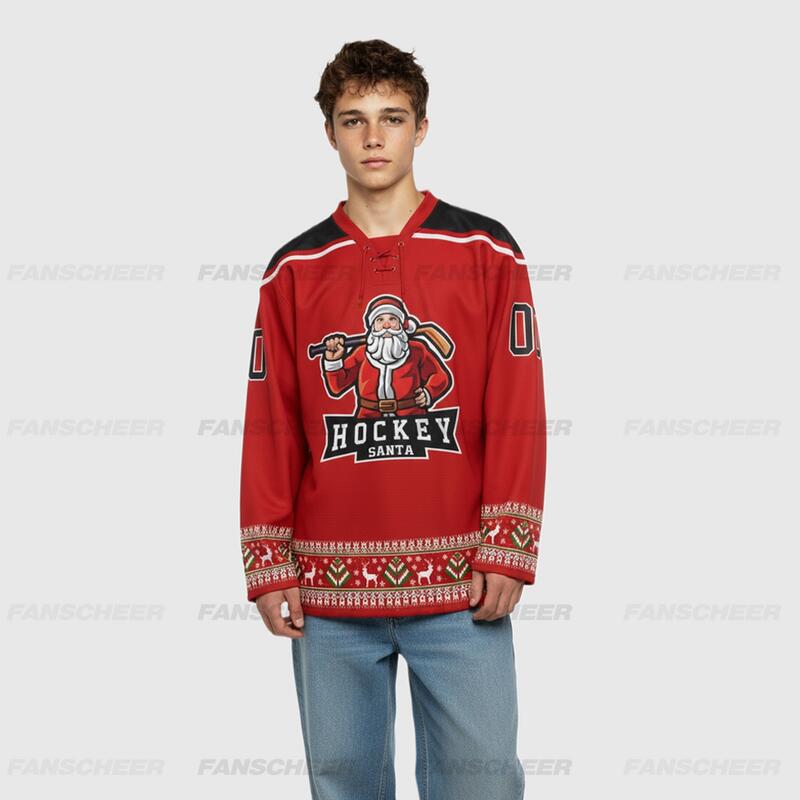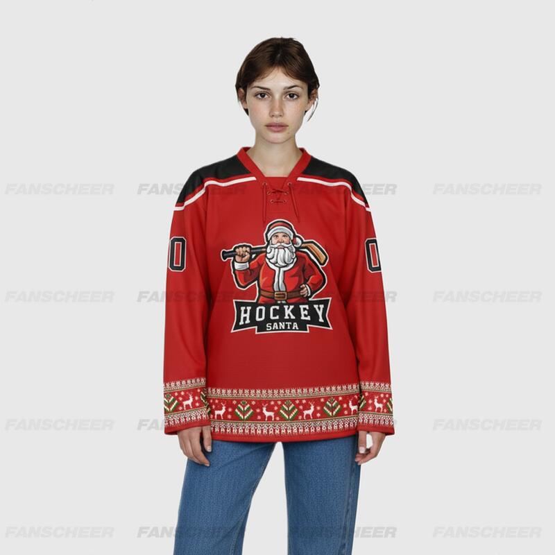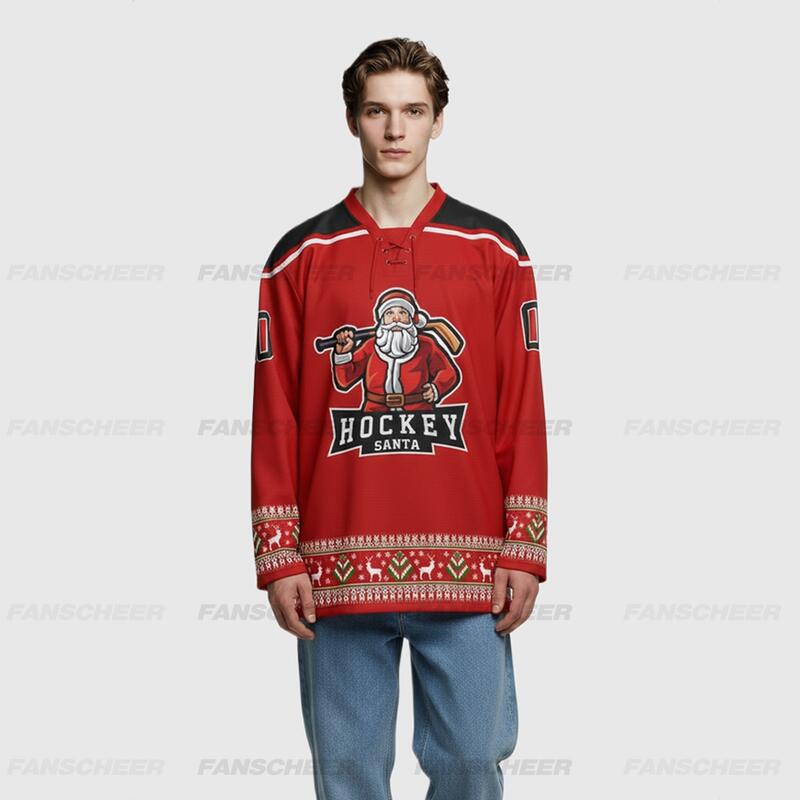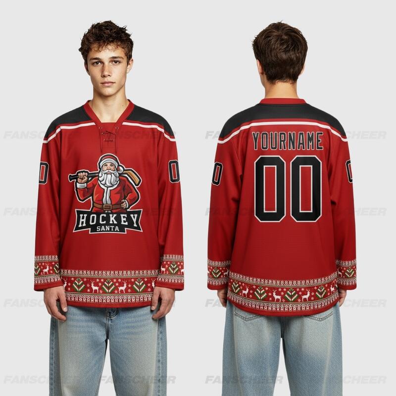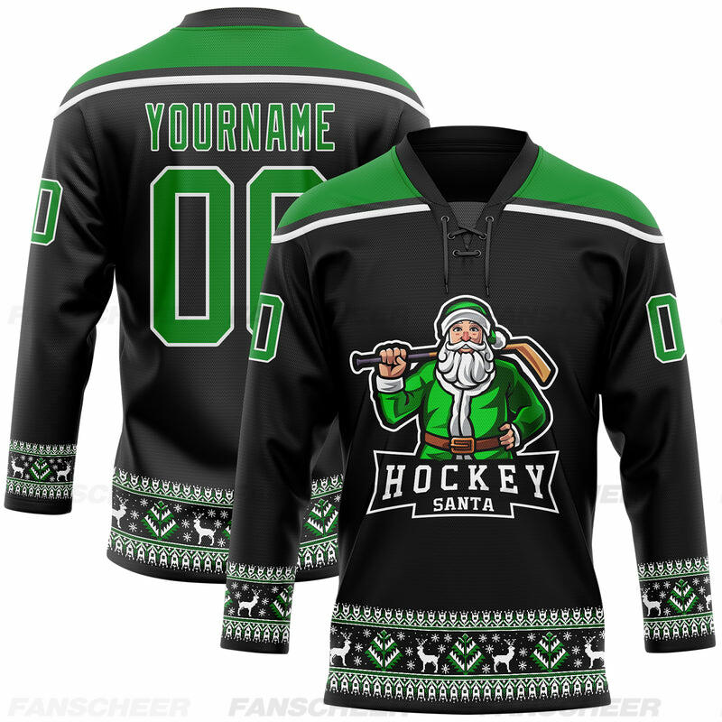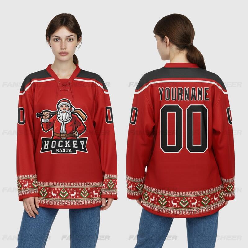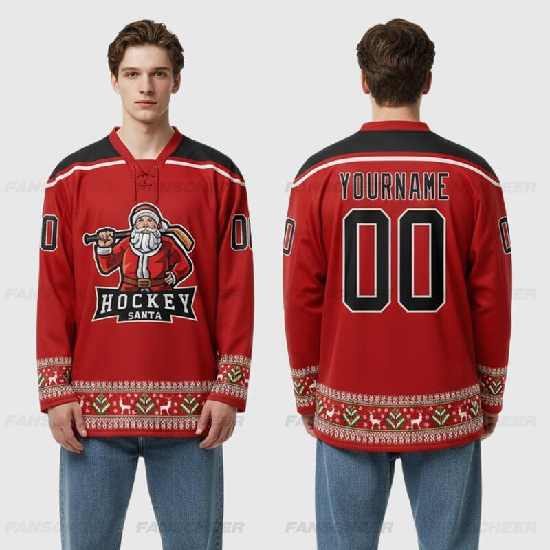 Custom Black Red-White Christmas Santa Claus 3D Hockey Lace Neck Jersey