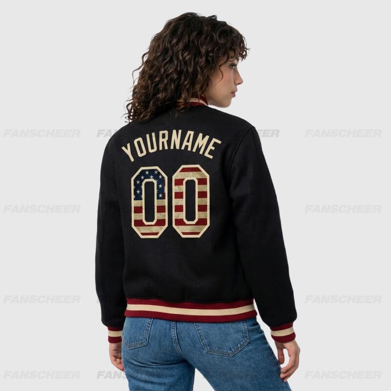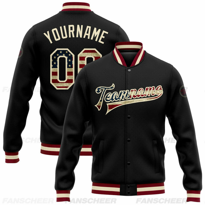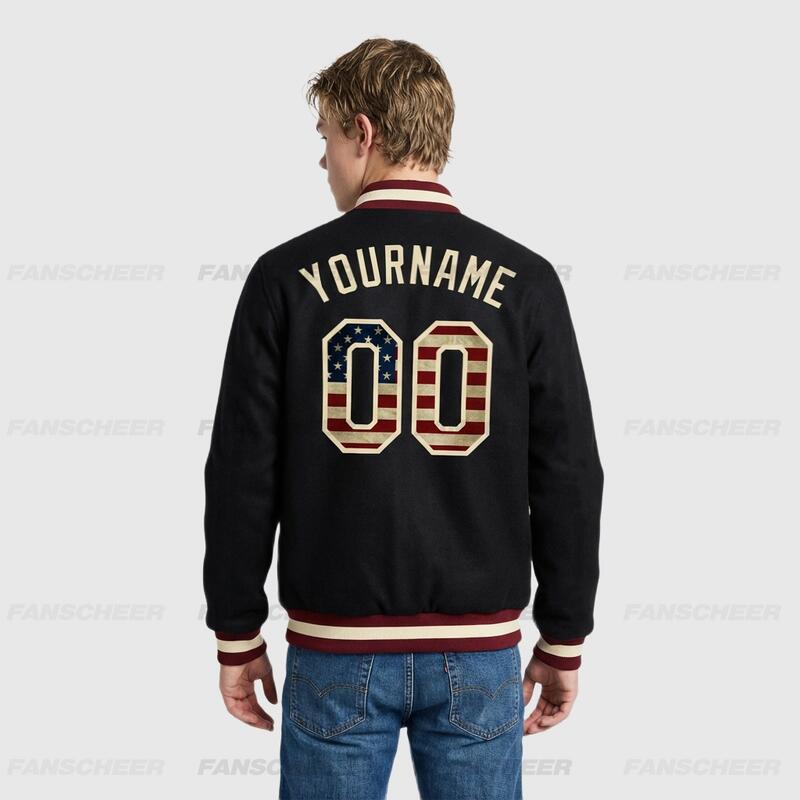 Custom Black USA Flag Full-Snap Varsity Letterman Jacket Perfect for Vintage-Style Events and Nostalgic Hangouts