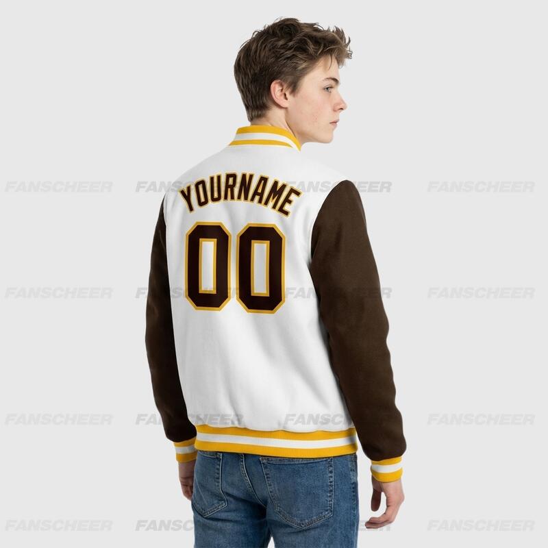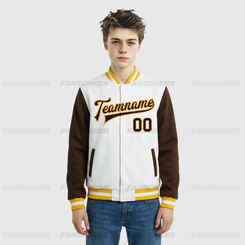 Custom Brown-White Two Tone Full-Snap Letterman Jacket – Ideal for Weekend Urban Strolls and Park Hangouts