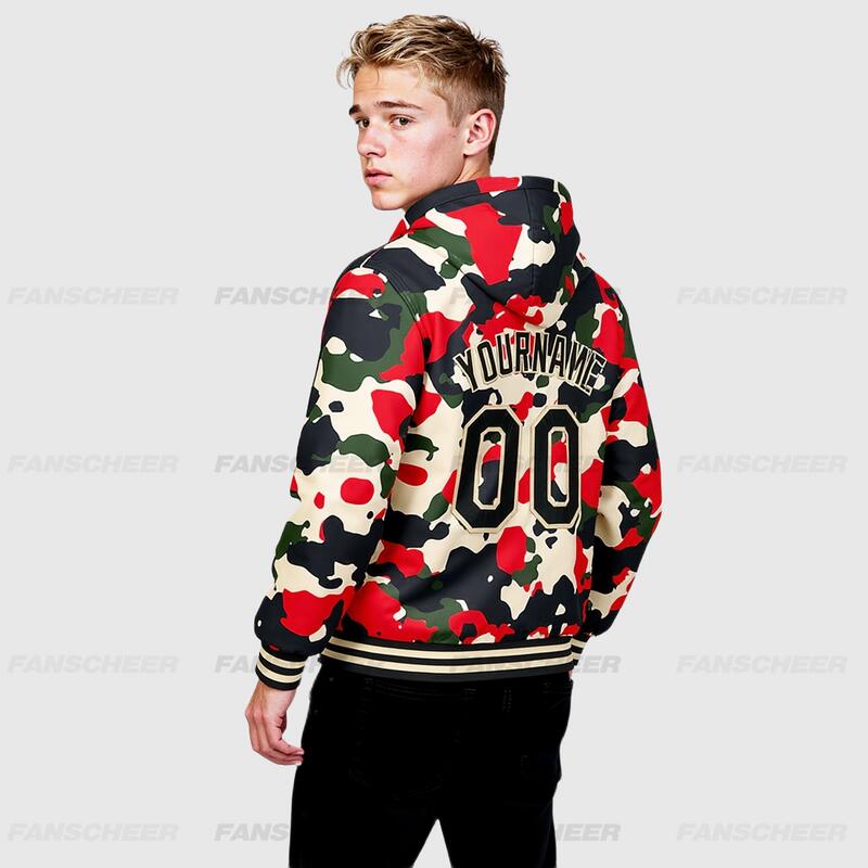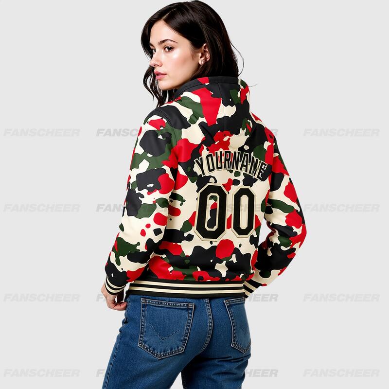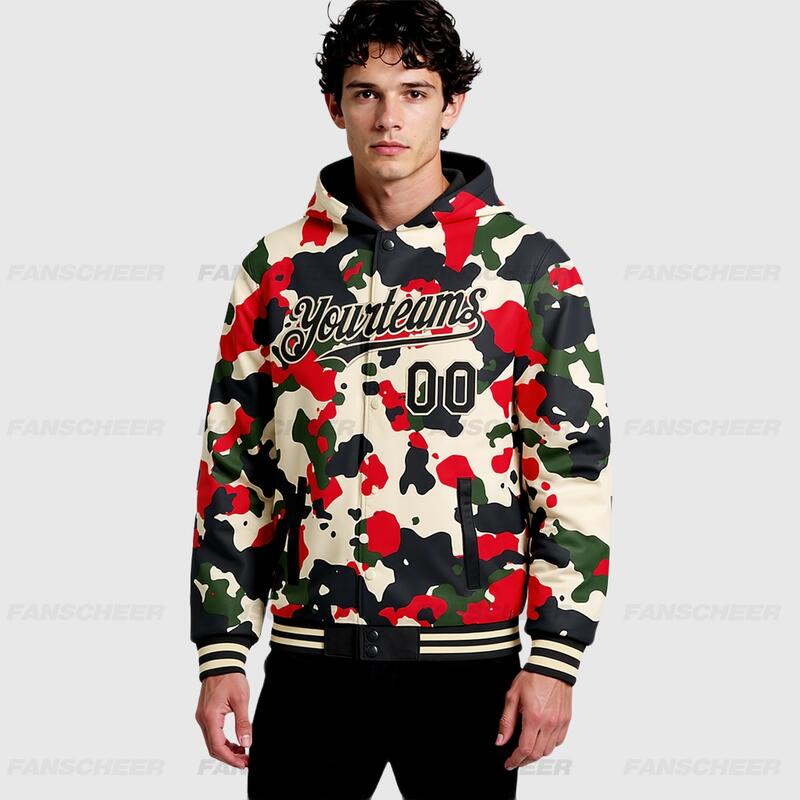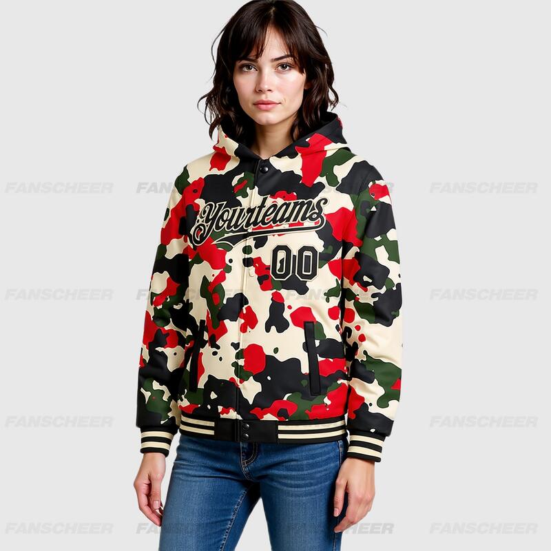Custom Camo Black-Cream Full-Snap Varsity Letterman Hoodie Jacket for Street-Style Daily Commute
