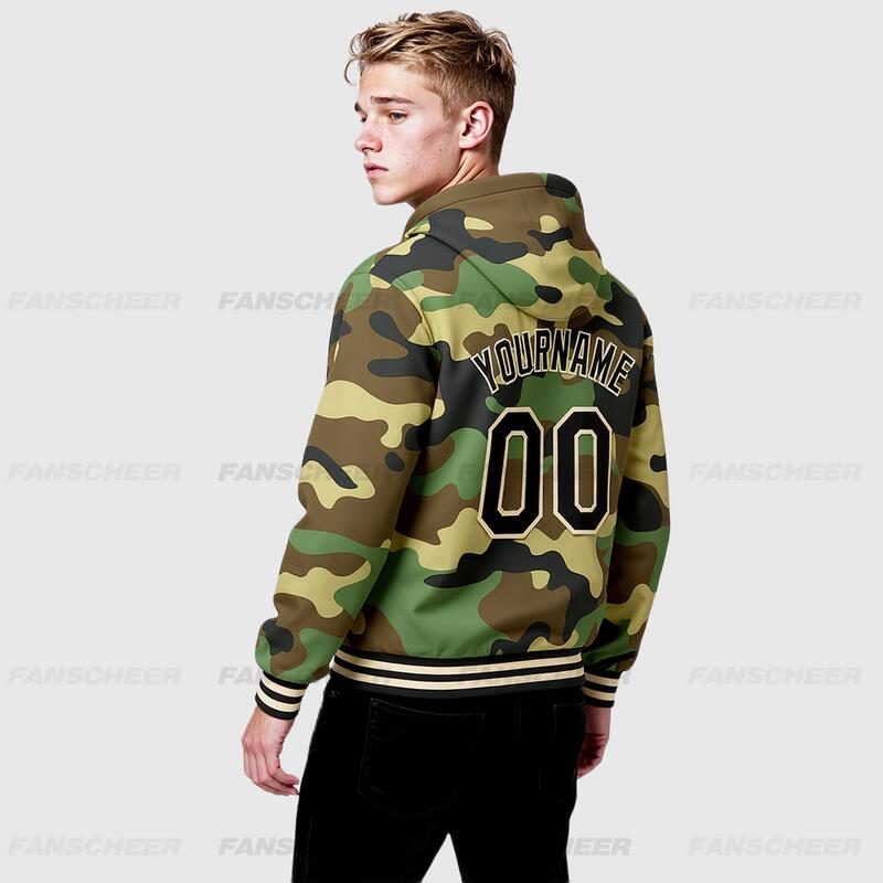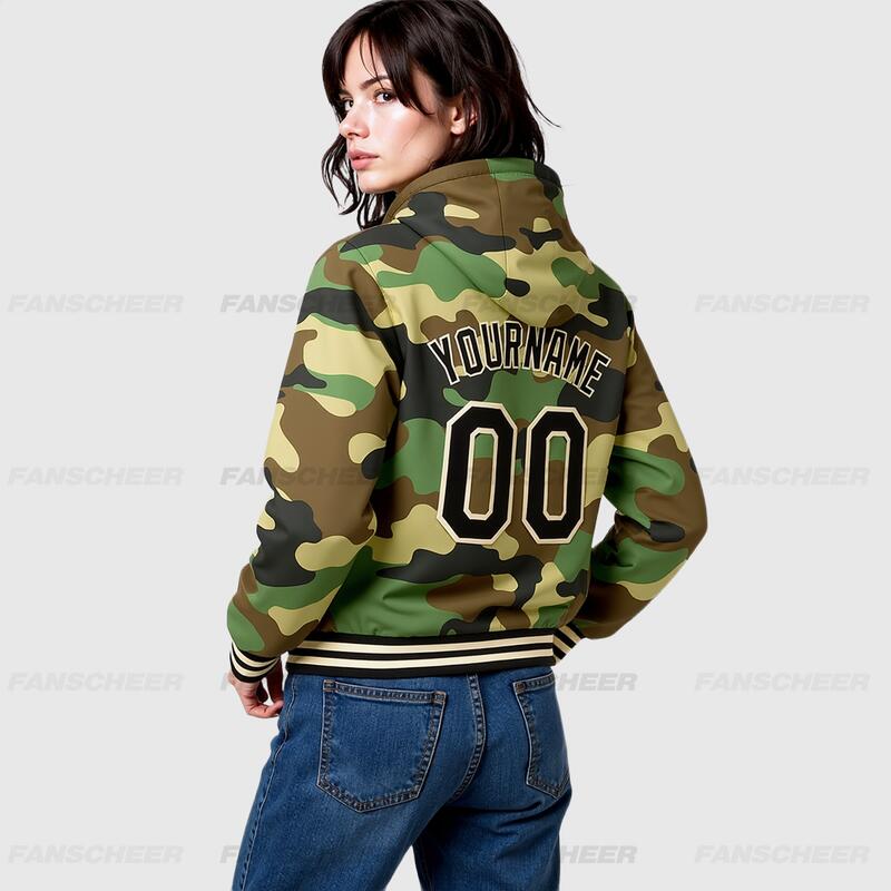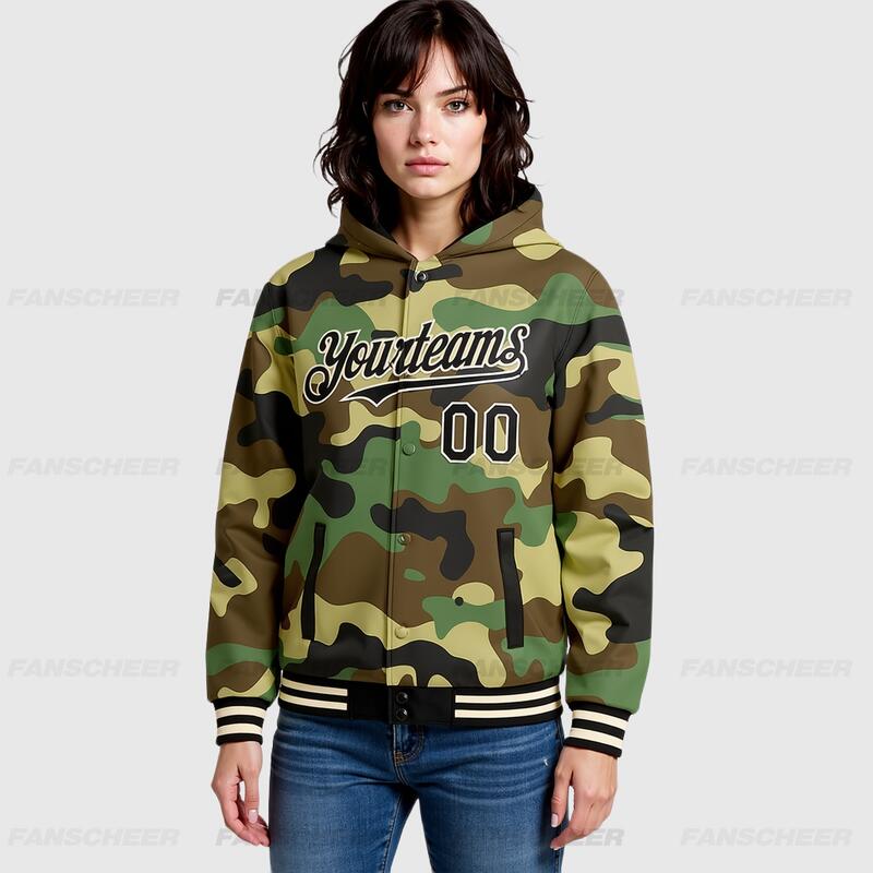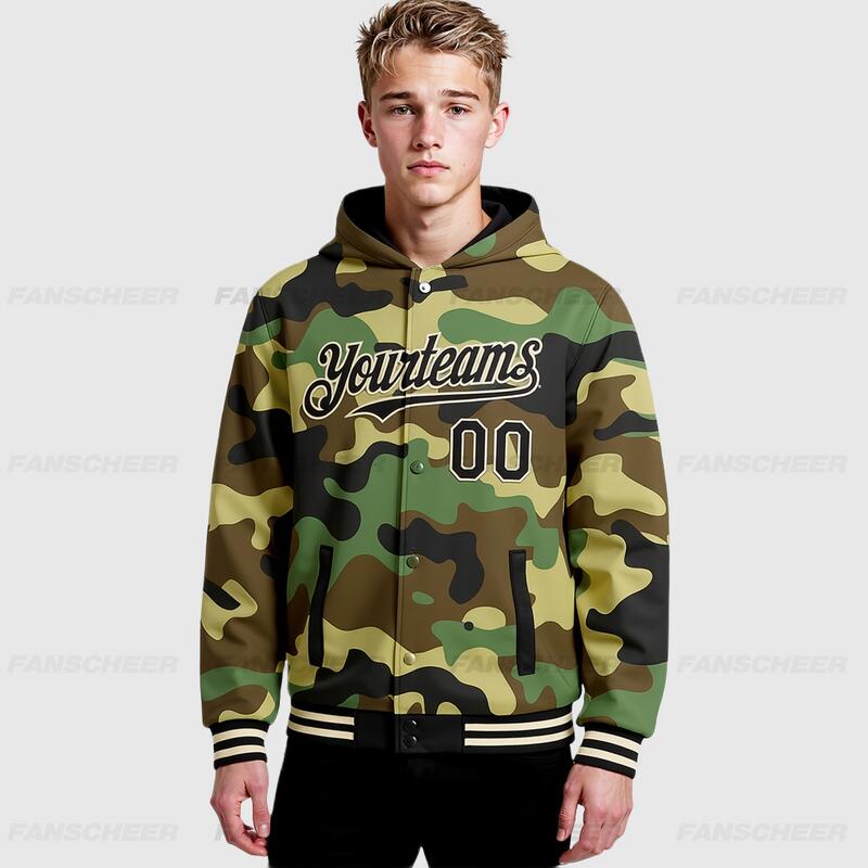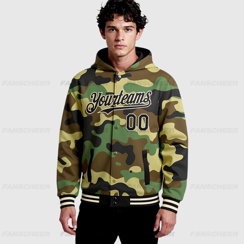 Custom Camo Full-Snap Varsity Letterman Hoodie Jacket for Street-Style Daily Commute