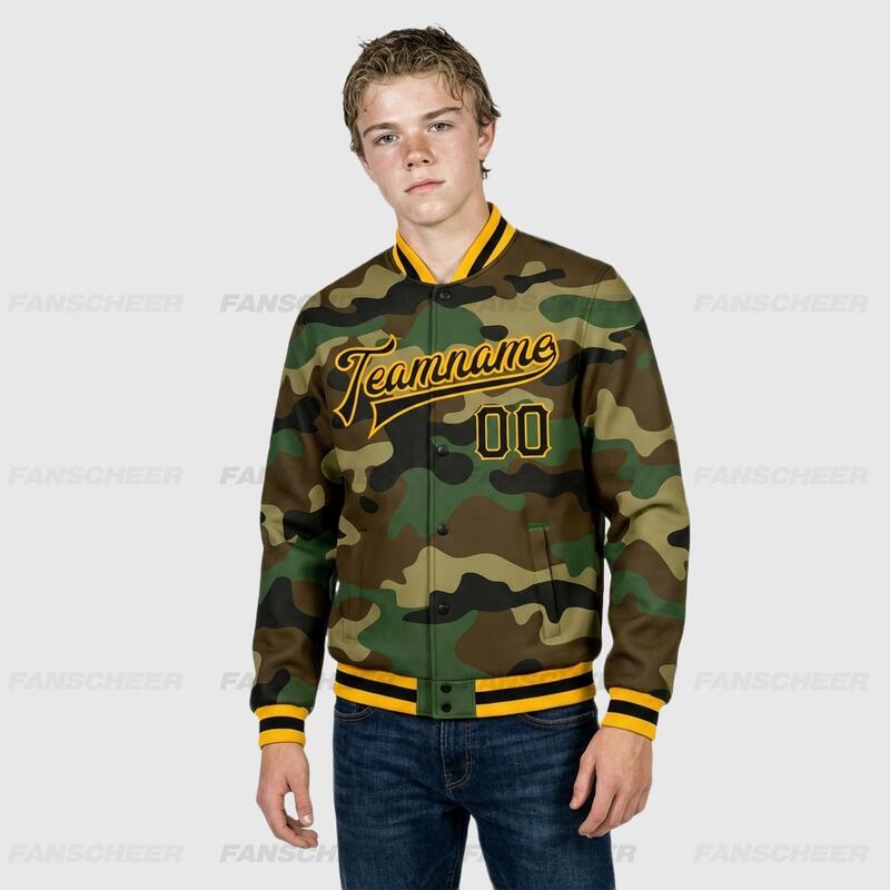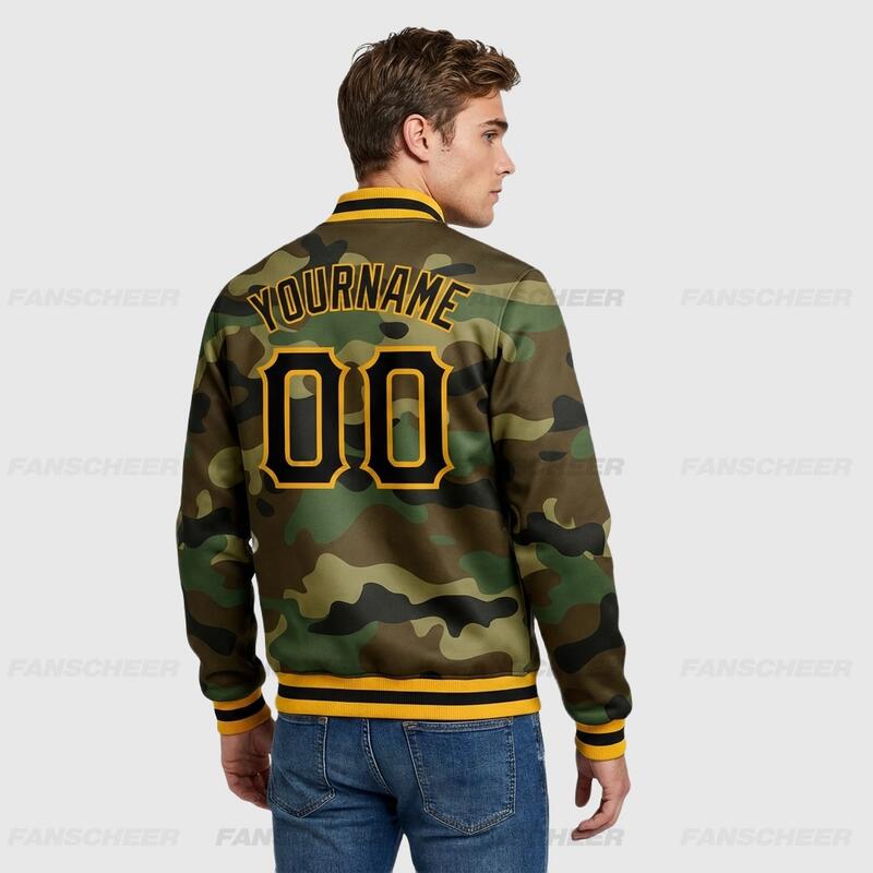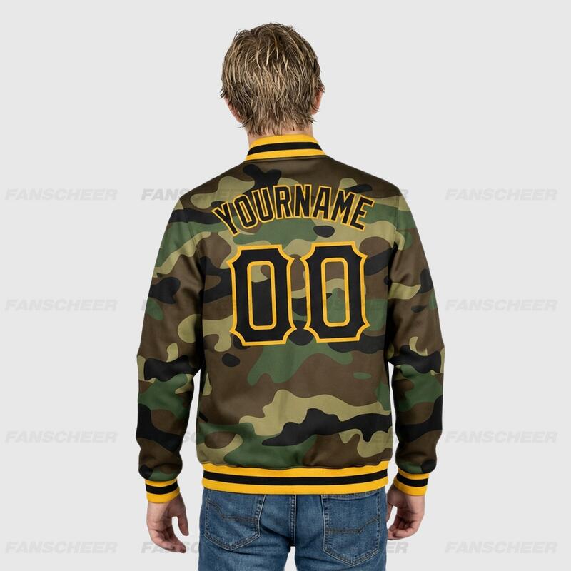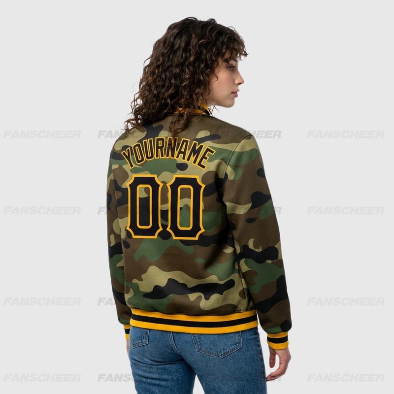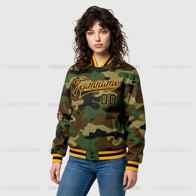 Custom Camo Full-Snap Varsity Letterman Salute To Service Jacket Great for Military-Themed Camping Trips and Veteran Bonding