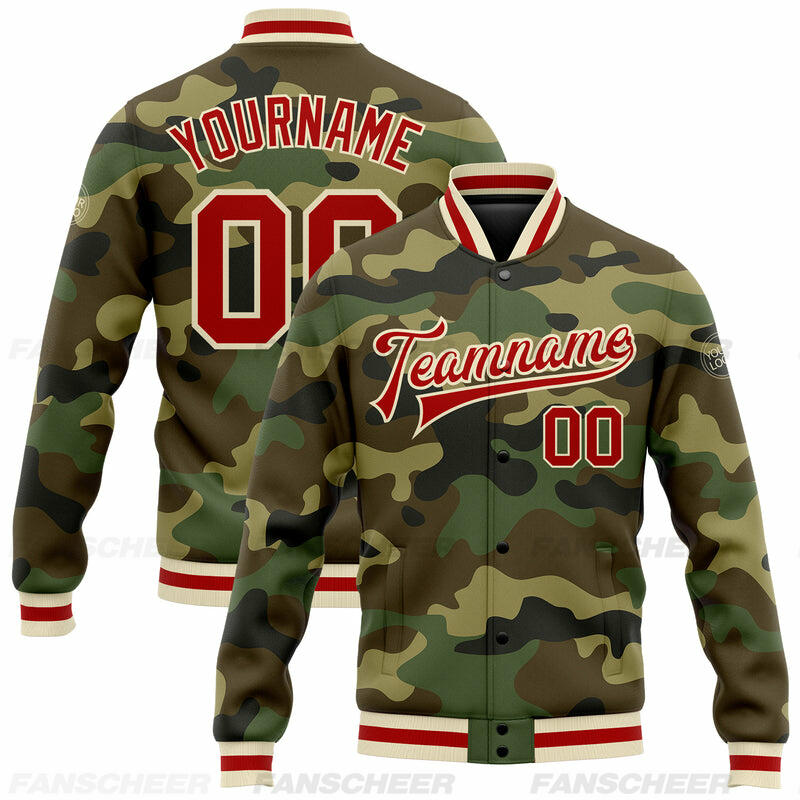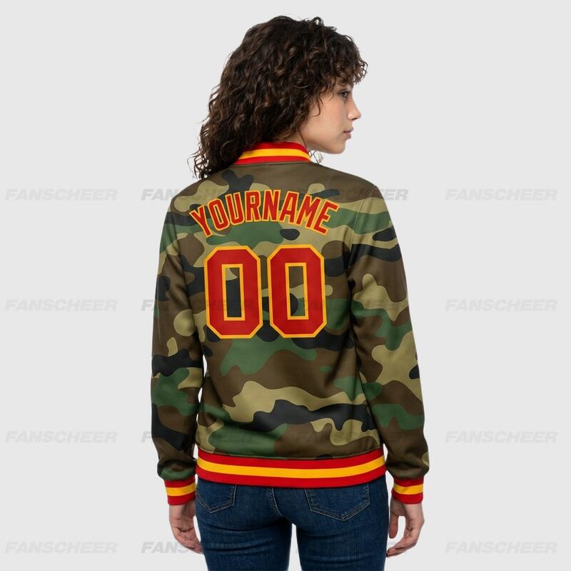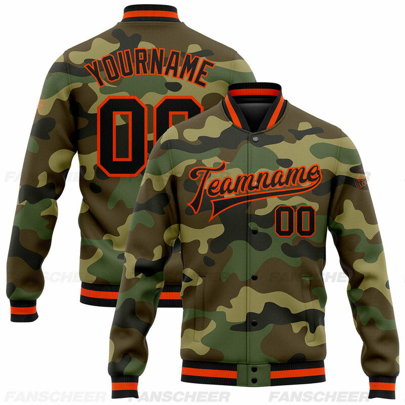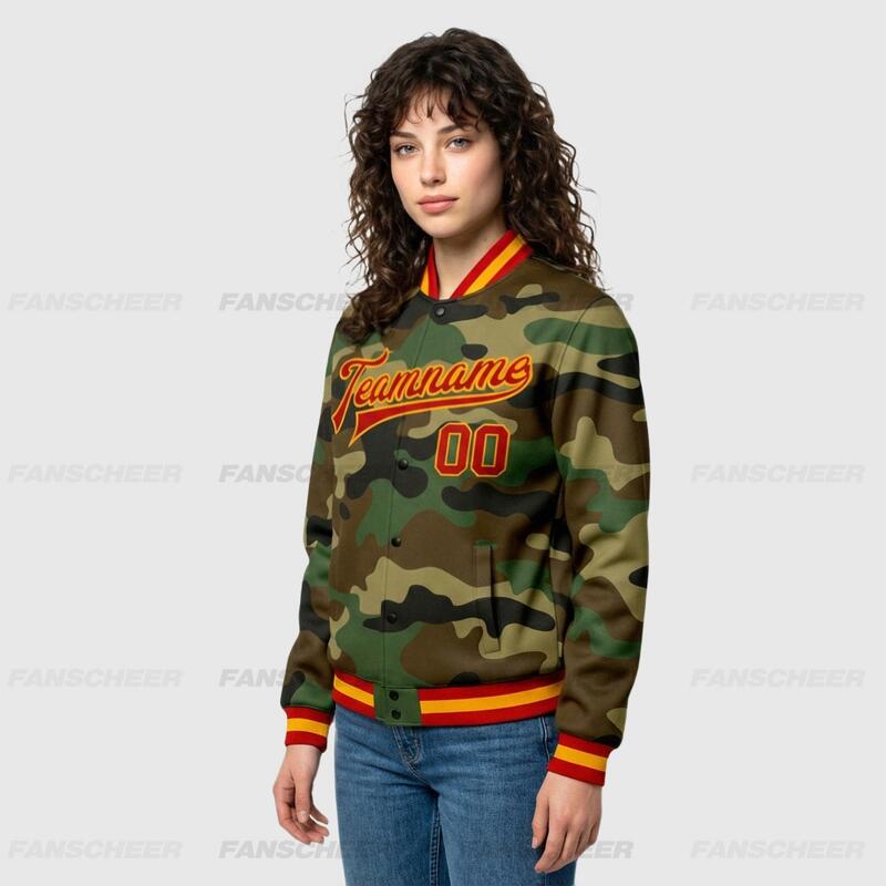Custom Camo Full-Snap Varsity Letterman Salute To Service Jacket Suitable for Patriotic Community Parades and Outdoor Ceremonies