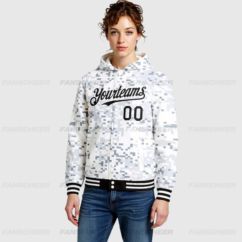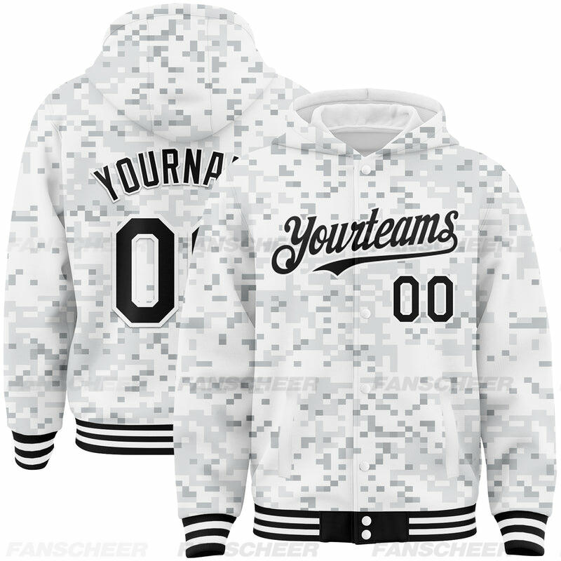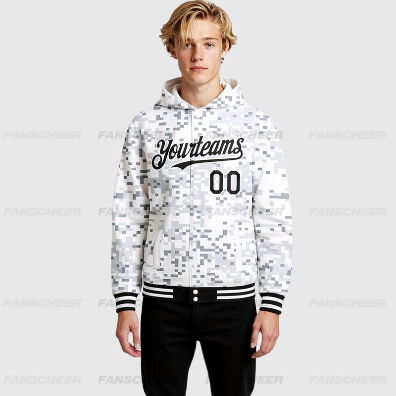 Custom Camo Hoodie Jacket Black-White Arctic Camouflage 3D Bomber Full-Snap Varsity Letterman Salute To Service Hoodie Jacket
