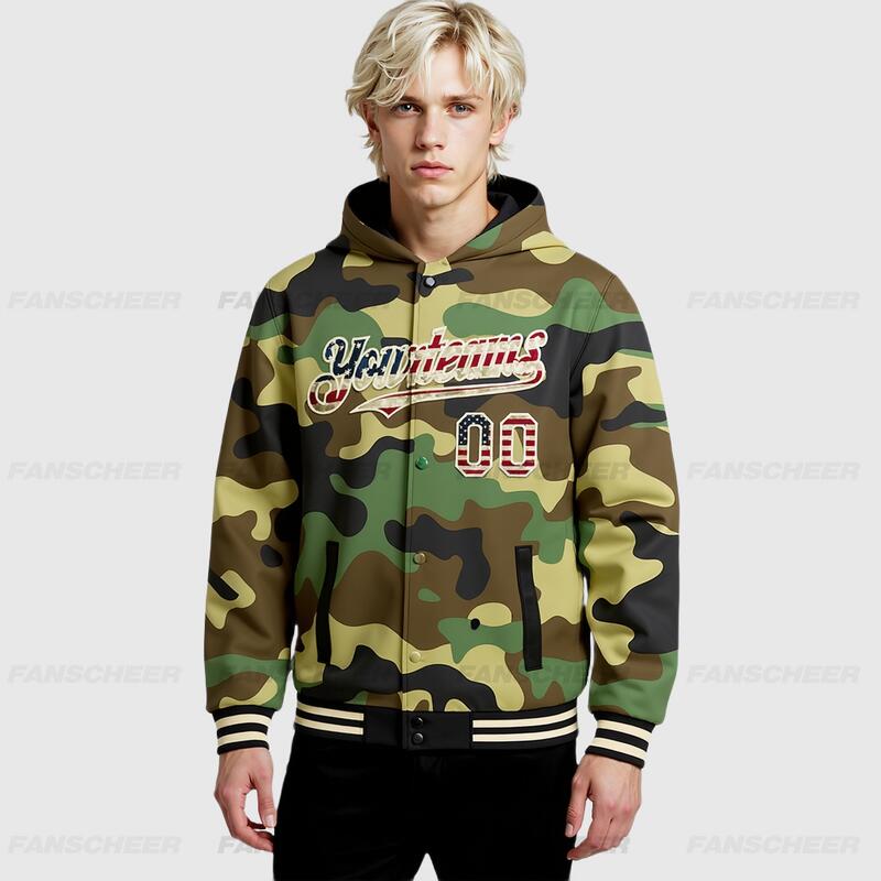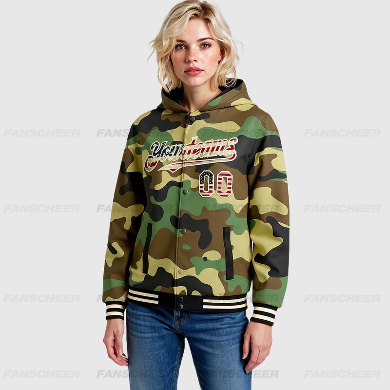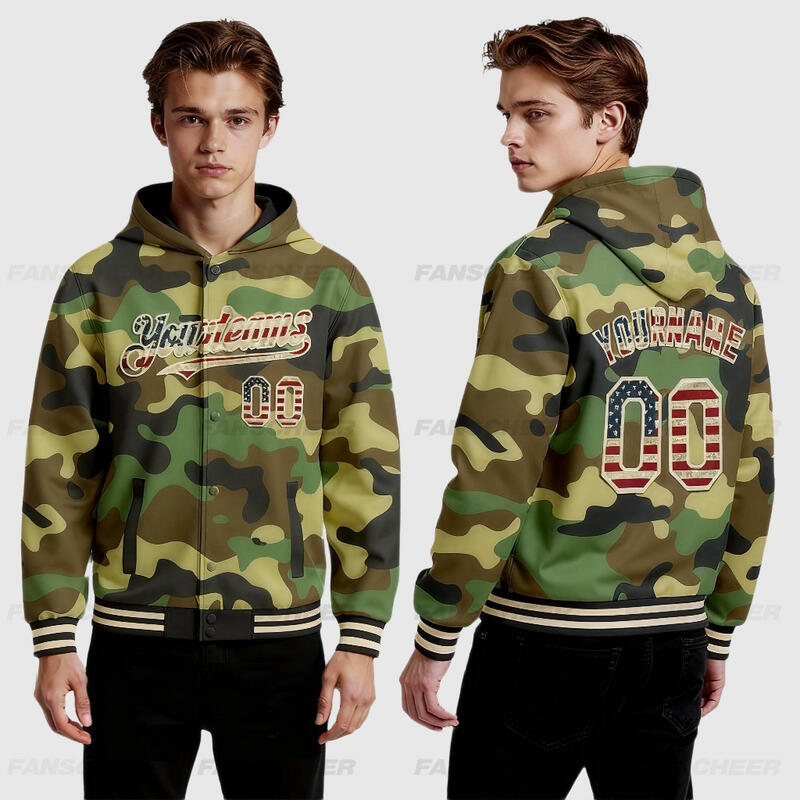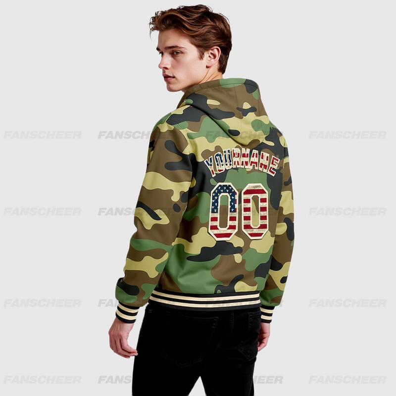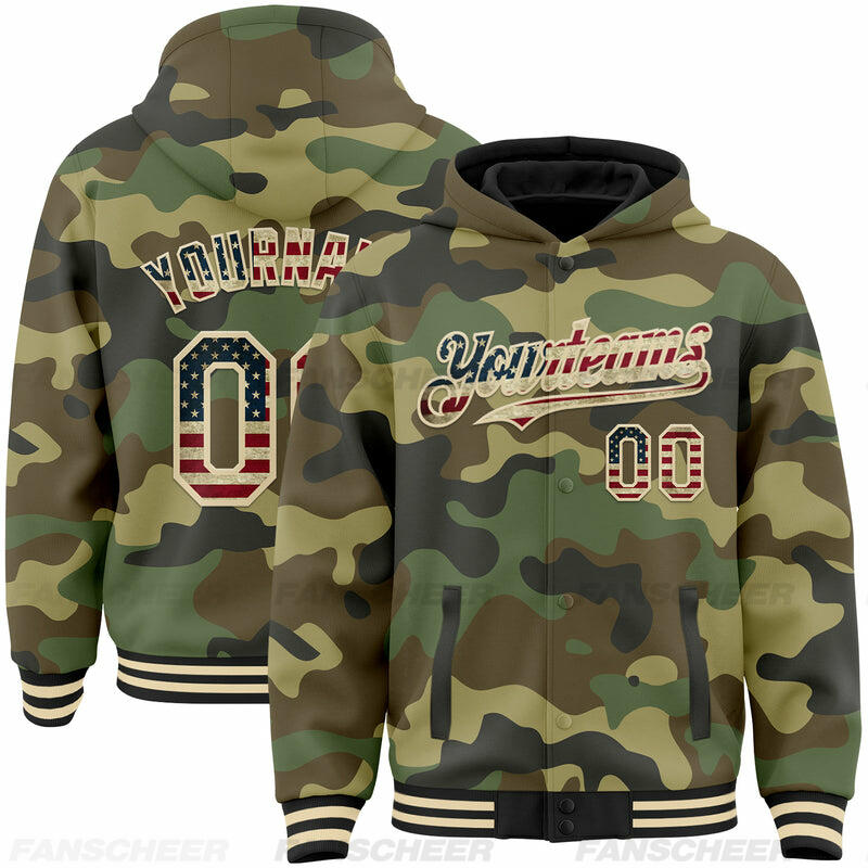 Custom Camo Hoodie Jacket Vintage USA Flag Cream-Black 3D Bomber Full-Snap Varsity Letterman Salute To Service Hoodie Jacket