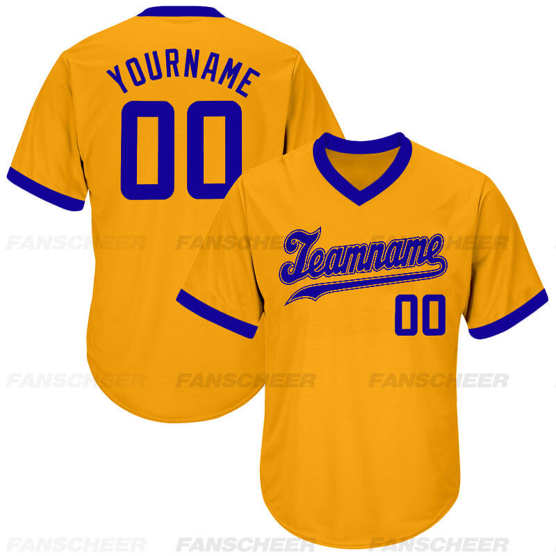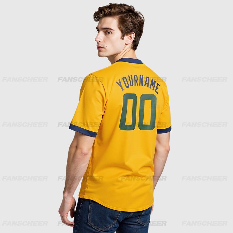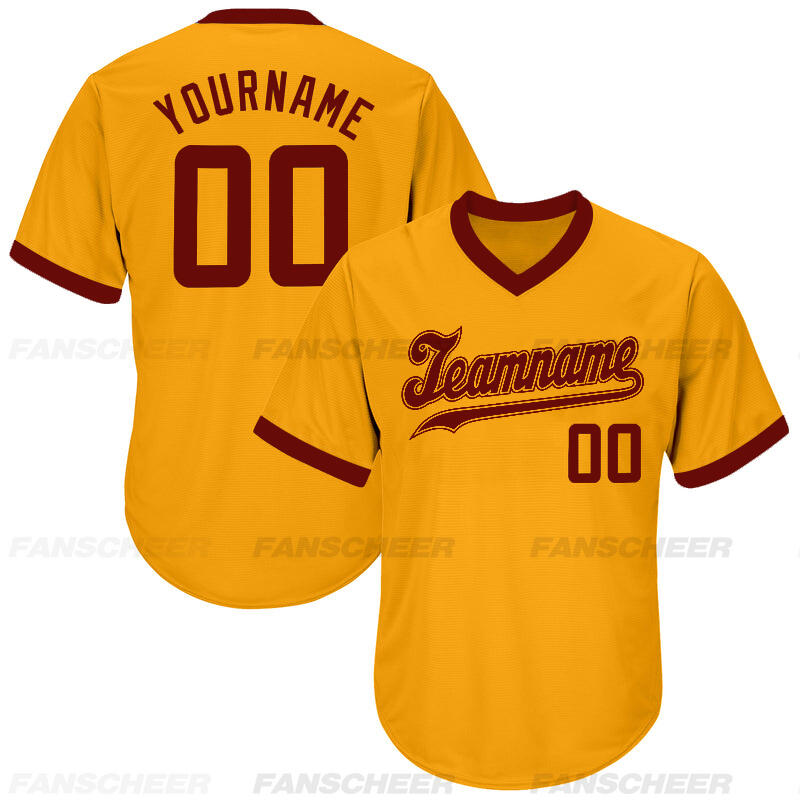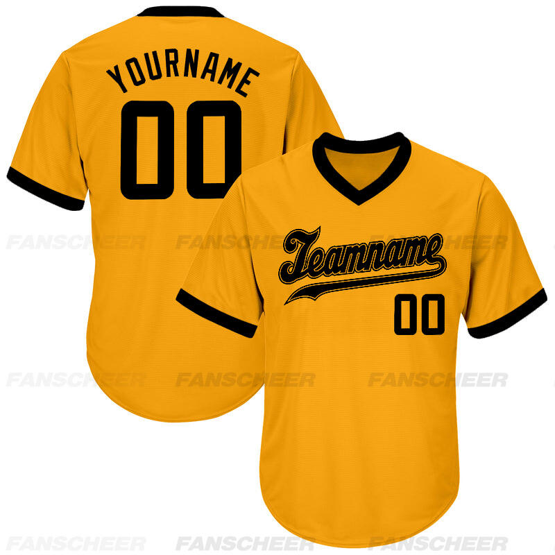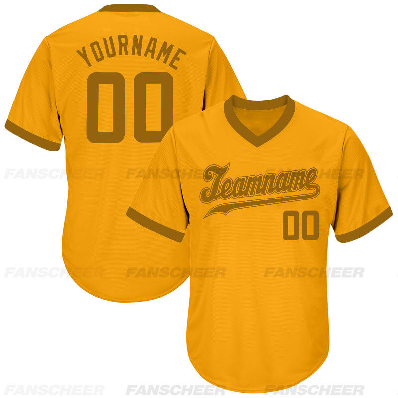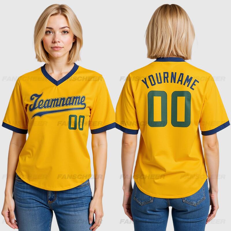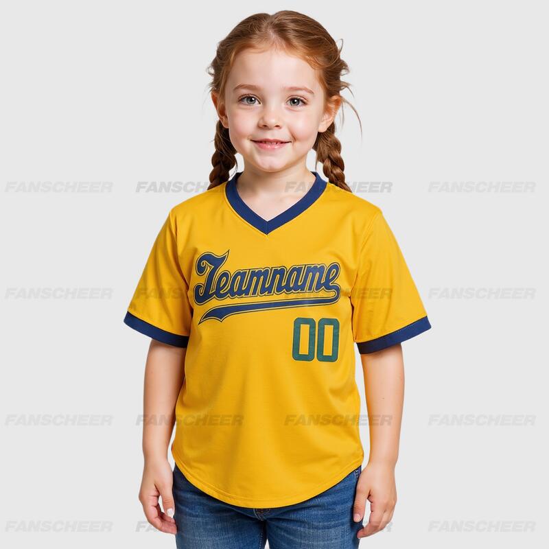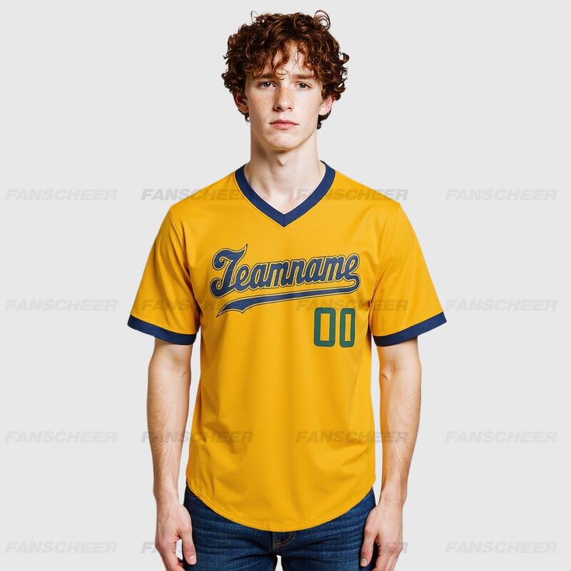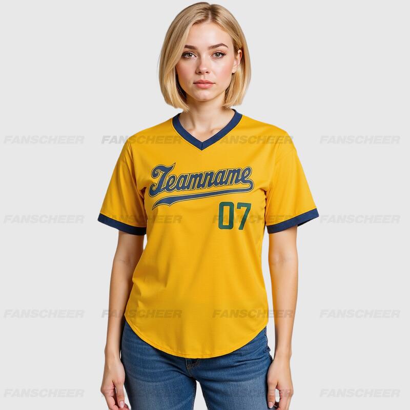 Custom Gold V-Neck Baseball Jersey with Personalized Number and Team Logo for Game Day Ready