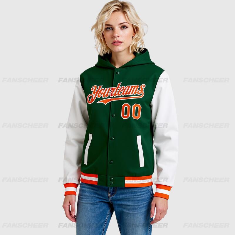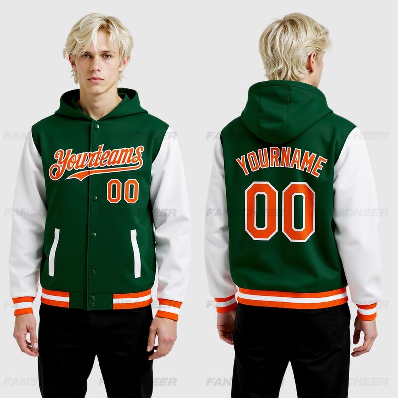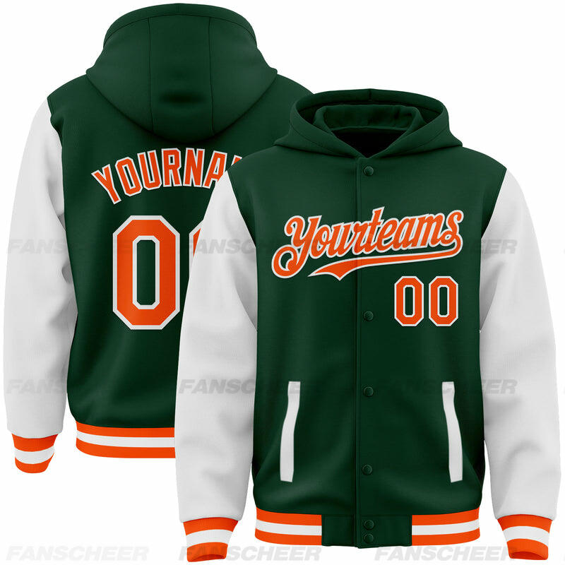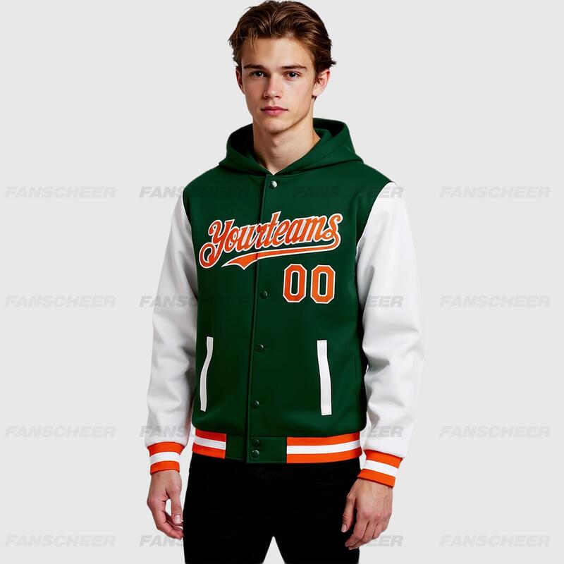 Custom Green Orange-White Bomber Full-Snap Varsity Letterman Two Tone Hoodie Jacket