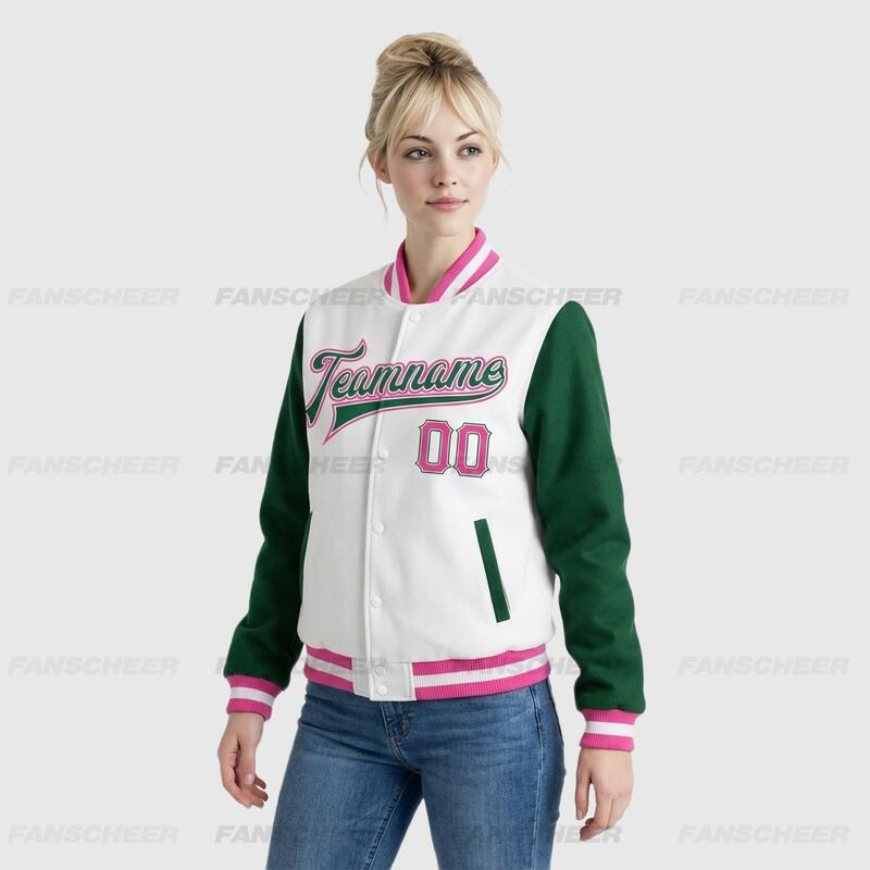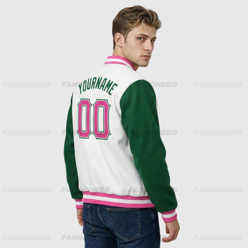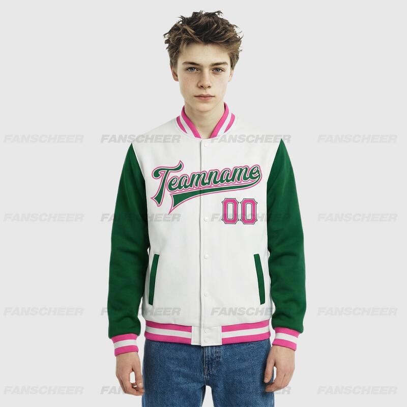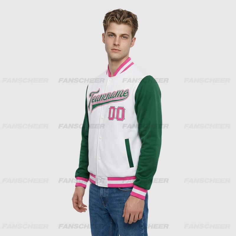 Custom Green-White Two Tone Full-Snap Letterman Jacket – Ideal for Daily Casual Outings