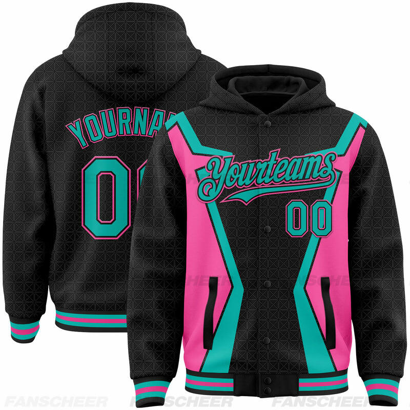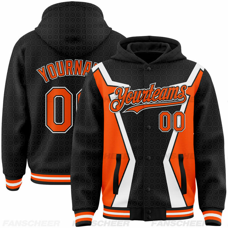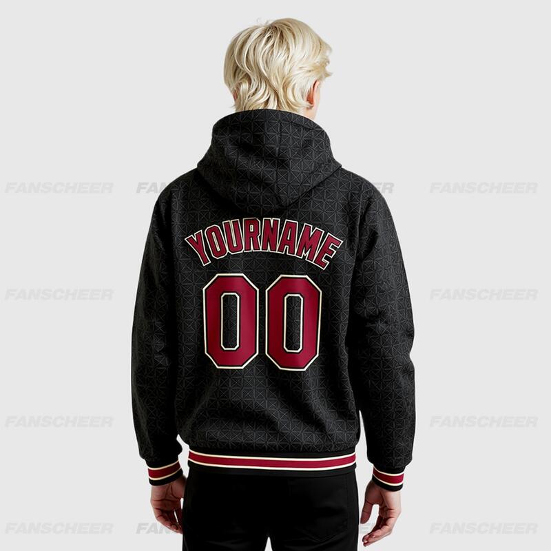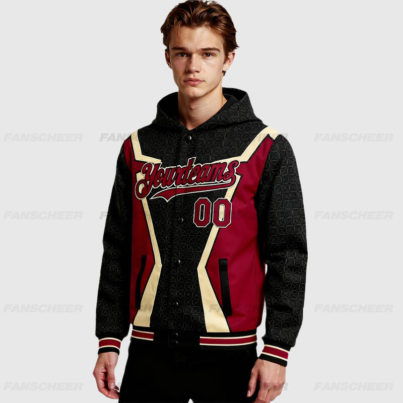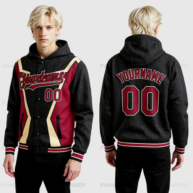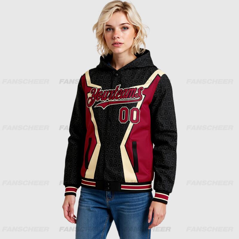 Custom Hoodie Jacket Black Crimson-City Cream Arrow 3D Pattern Design Bomber Full-Snap Varsity Letterman Hoodie Jacket