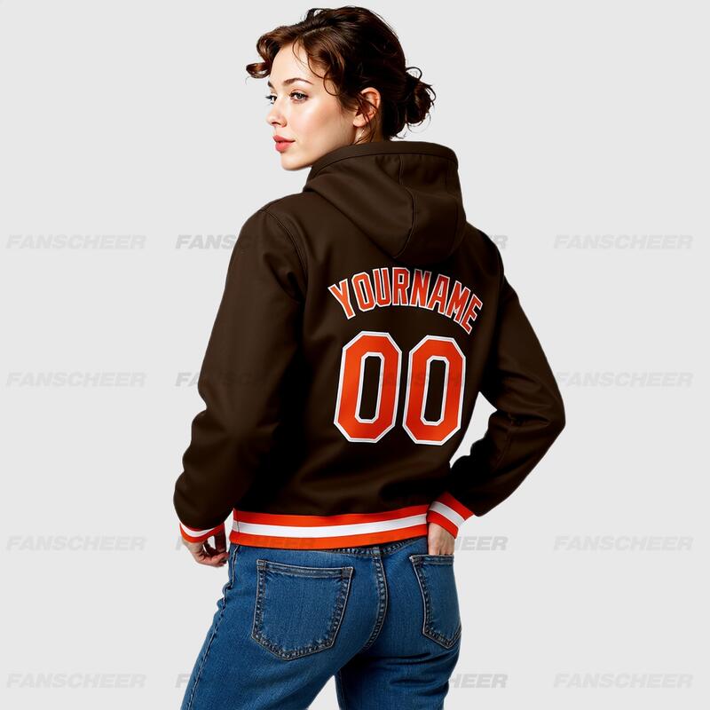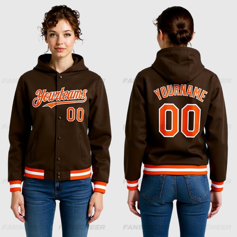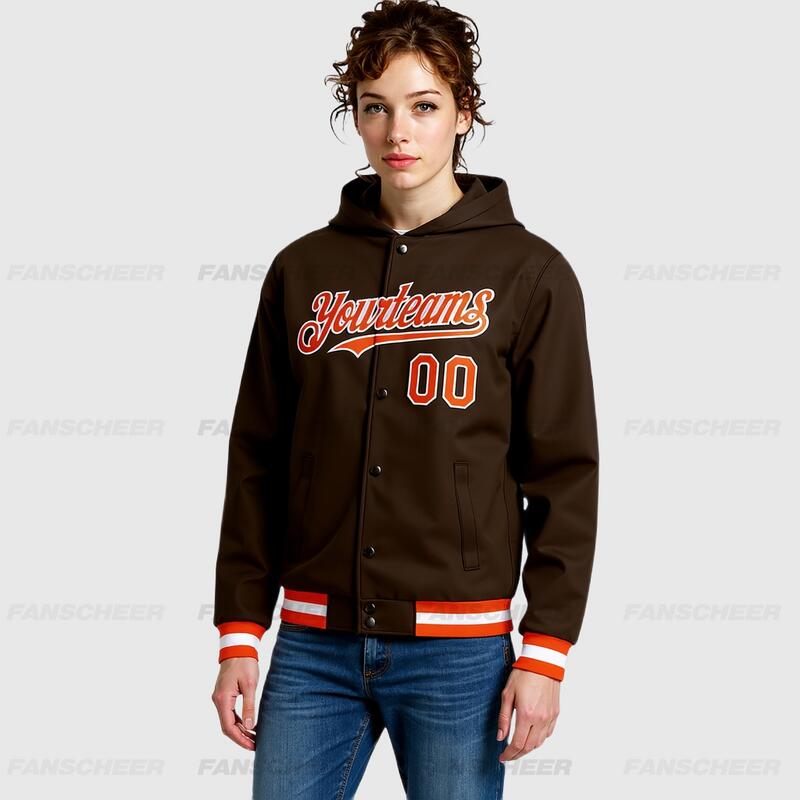 Custom Hoodie Jacket Brown Orange-White Bomber Full-Snap Varsity Letterman Hoodie Jacket