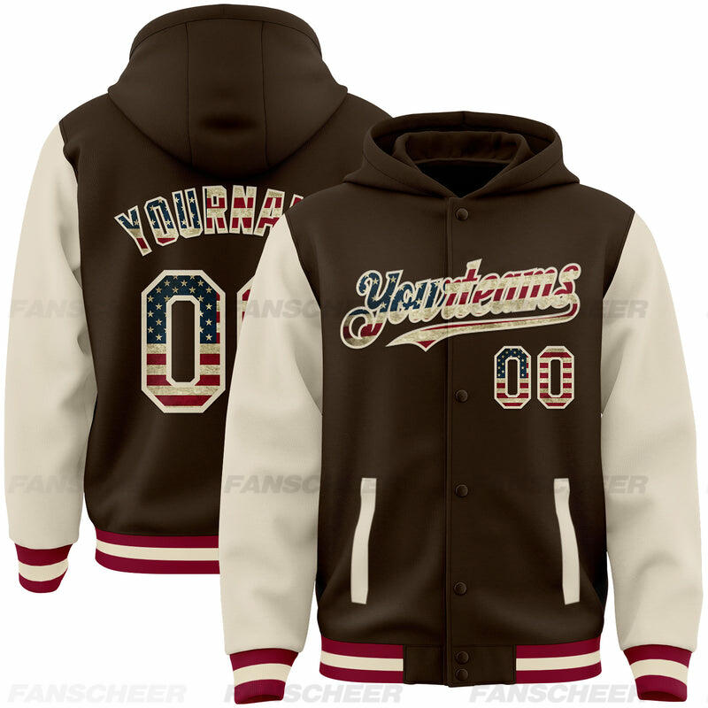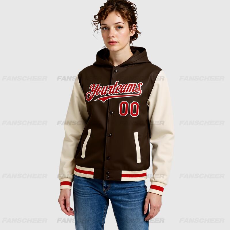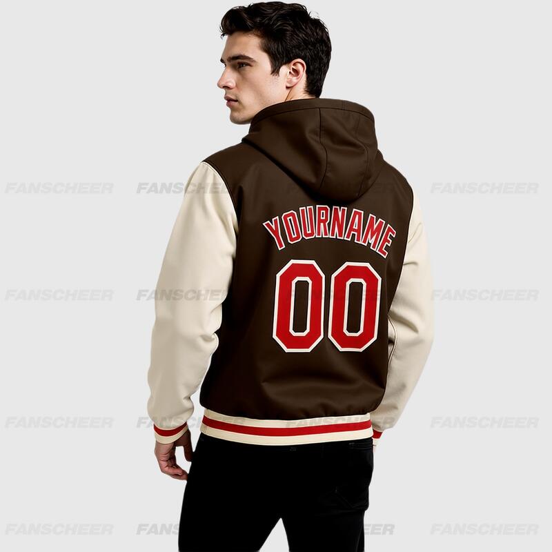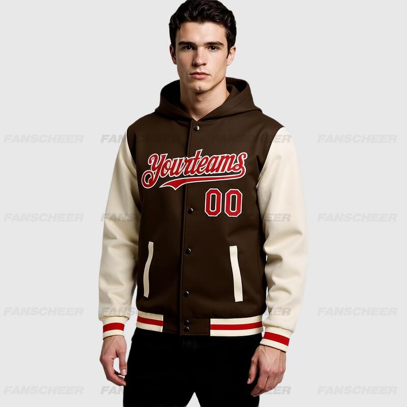 Custom Hoodie Jacket Brown Red-Cream Bomber Full-Snap Varsity Letterman Two Tone Hoodie Jacket