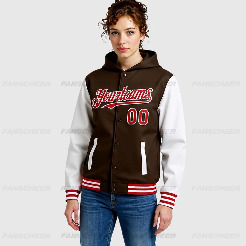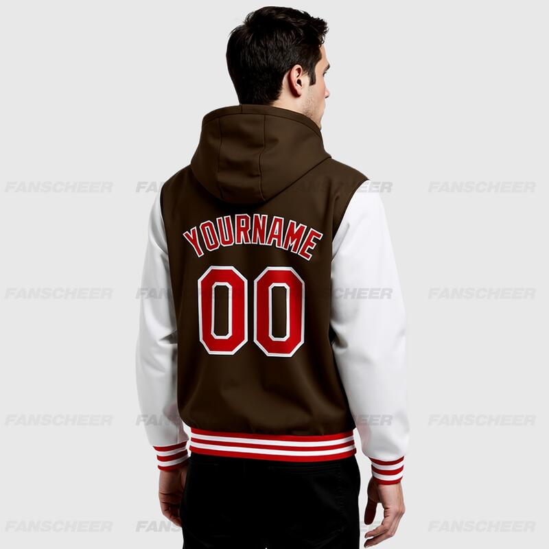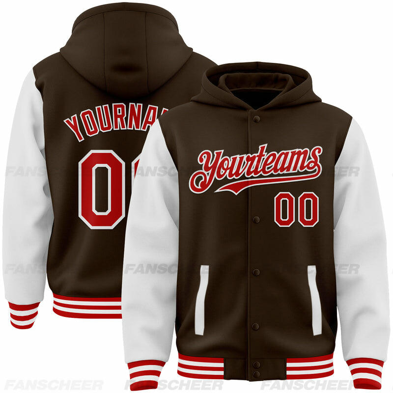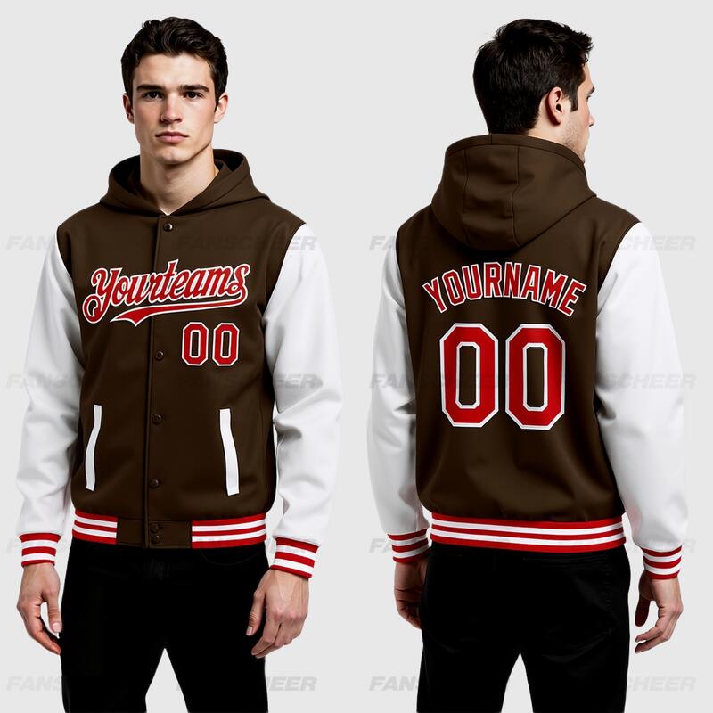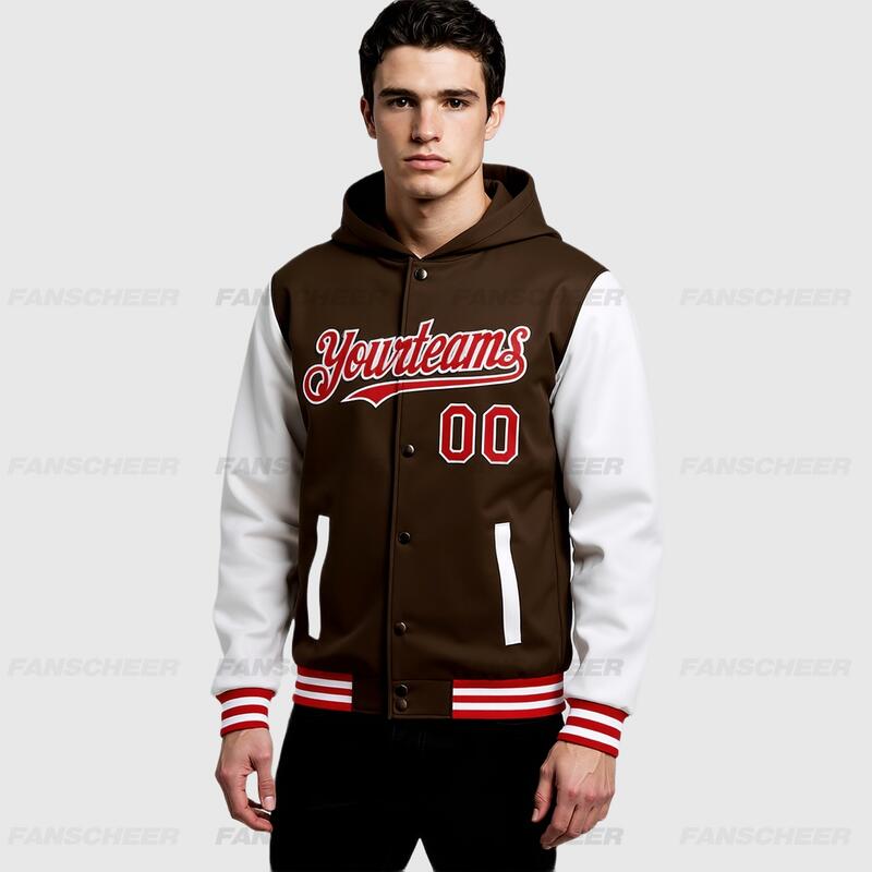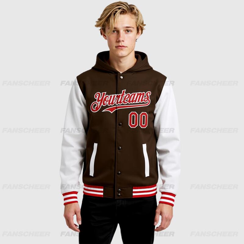 Custom Hoodie Jacket Brown Red-White Bomber Full-Snap Varsity Letterman Two Tone Hoodie Jacket