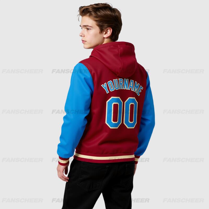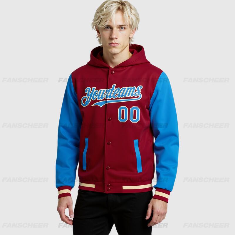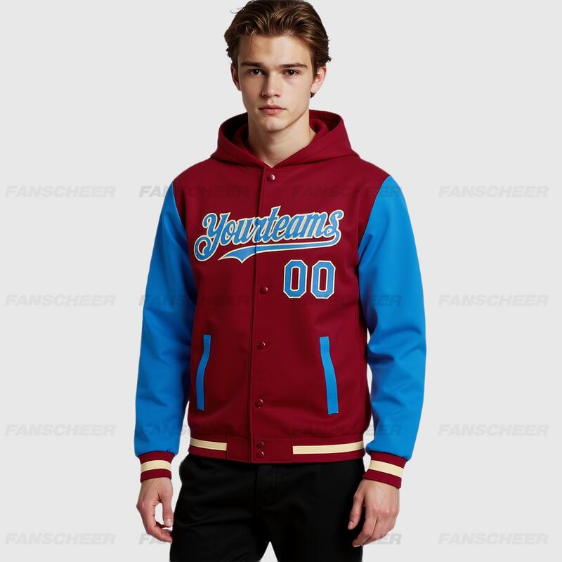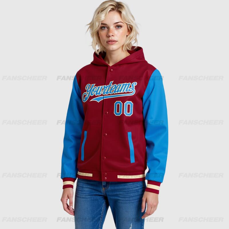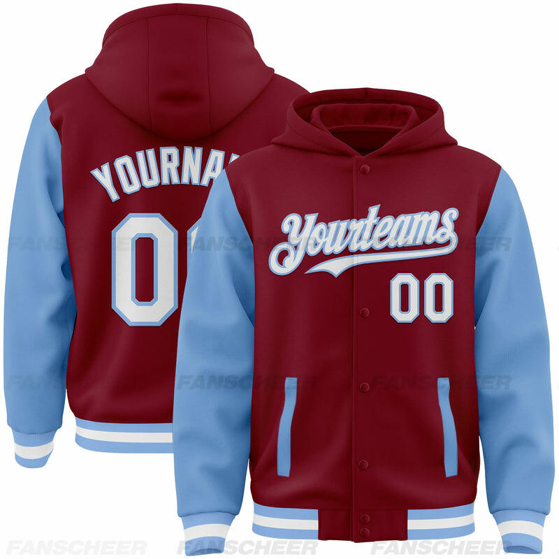 Custom Hoodie Jacket Crimson Powder Blue Cream-Maroon Bomber Full-Snap Varsity Letterman Two Tone Hoodie Jacket