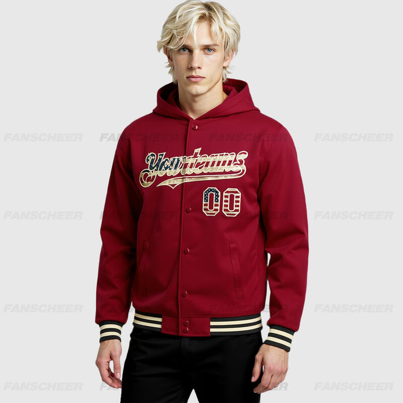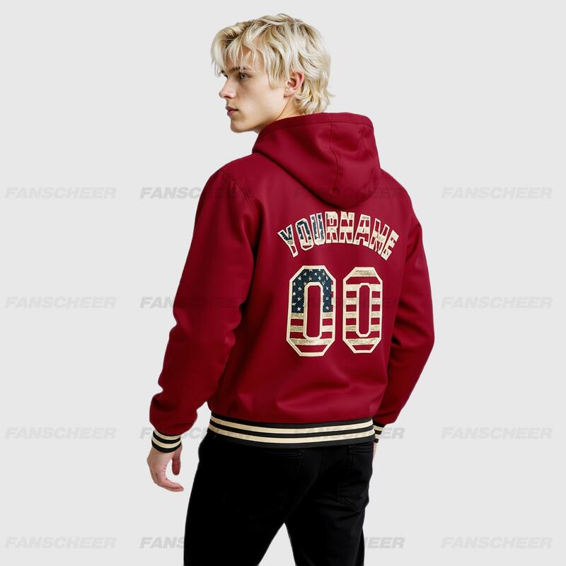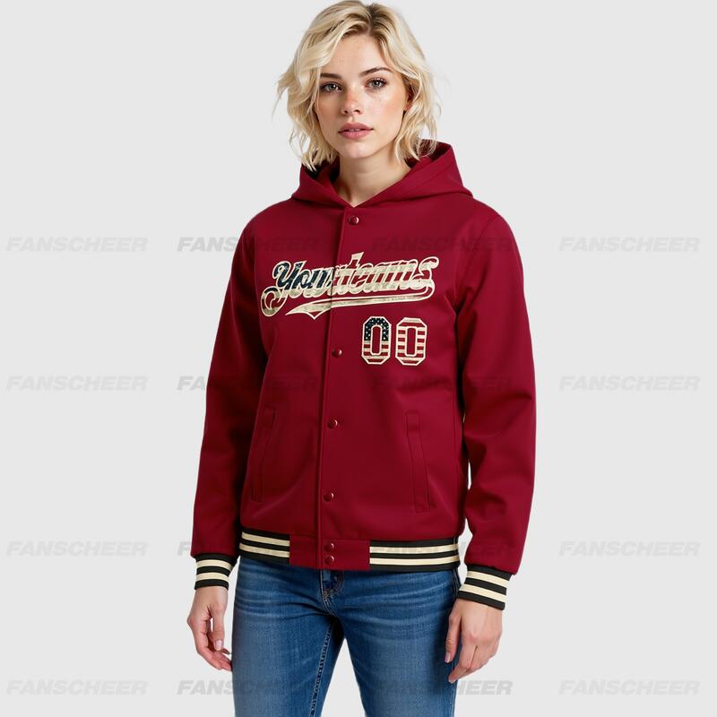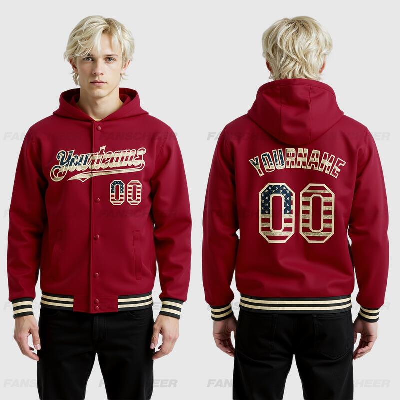 Custom Hoodie Jacket Crimson Vintage USA Flag Cream-Black Bomber Full-Snap Varsity Letterman Hoodie Jacket