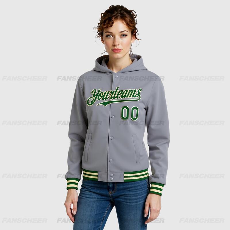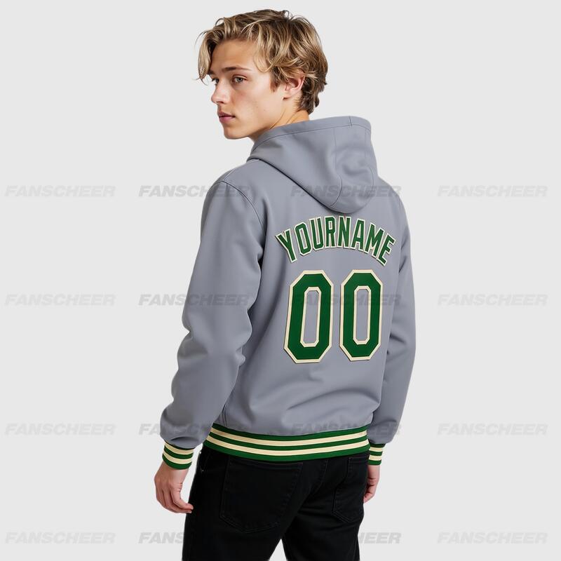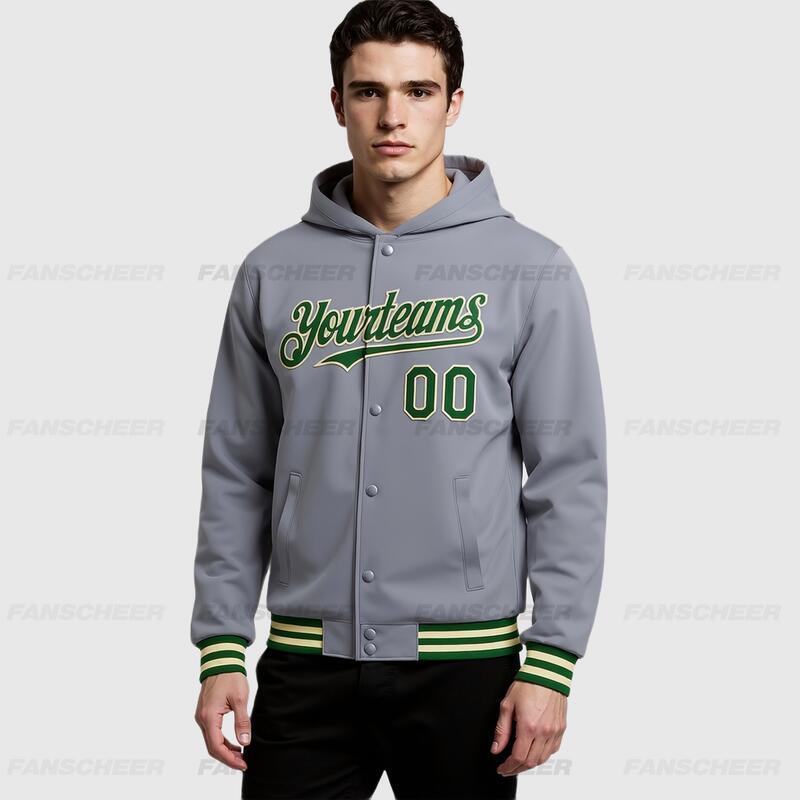 Custom Hoodie Jacket Gray Green-Cream Bomber Full-Snap Varsity Letterman Hoodie Jacket