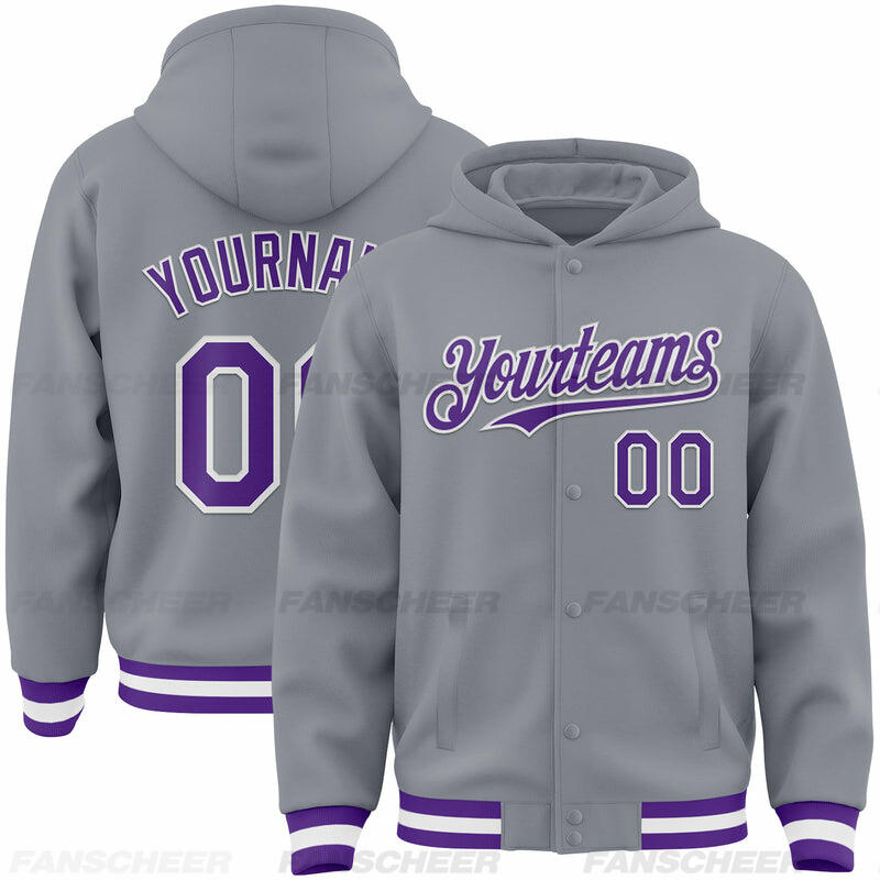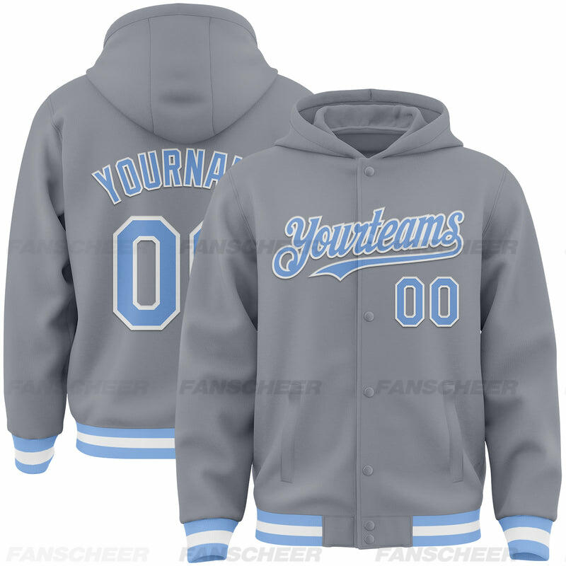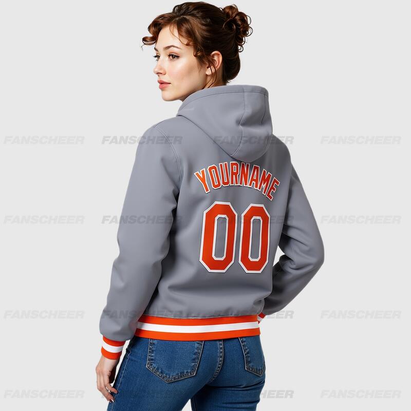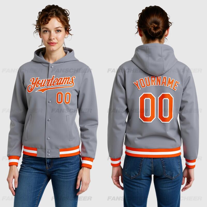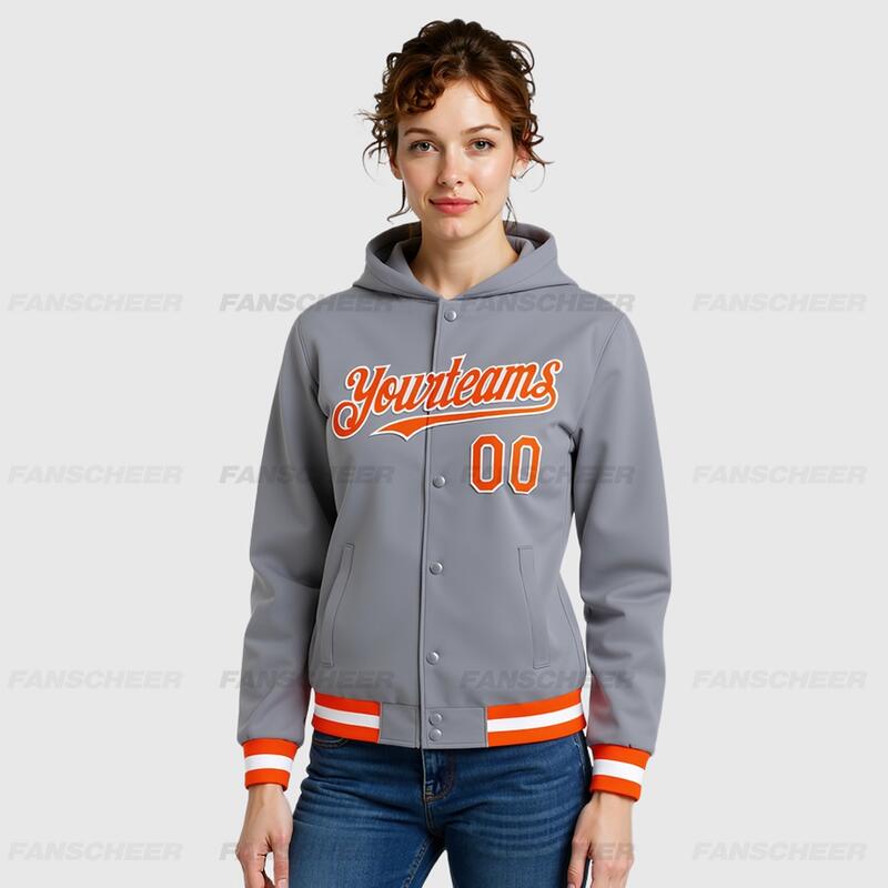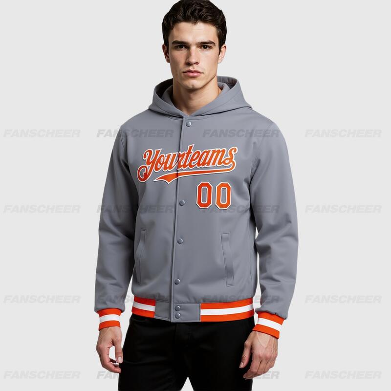 Custom Hoodie Jacket Gray Orange-White Bomber Full-Snap Varsity Letterman Hoodie Jacket
