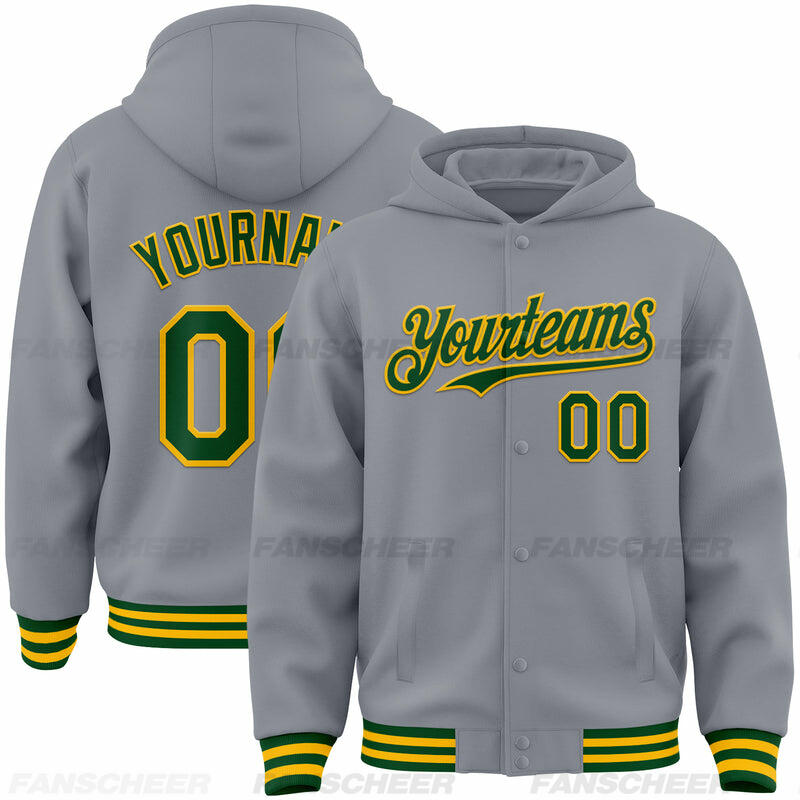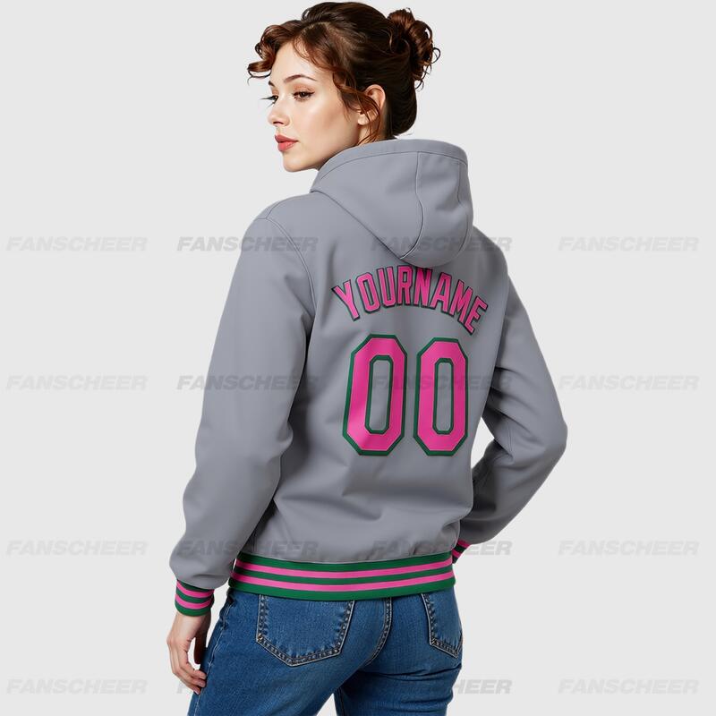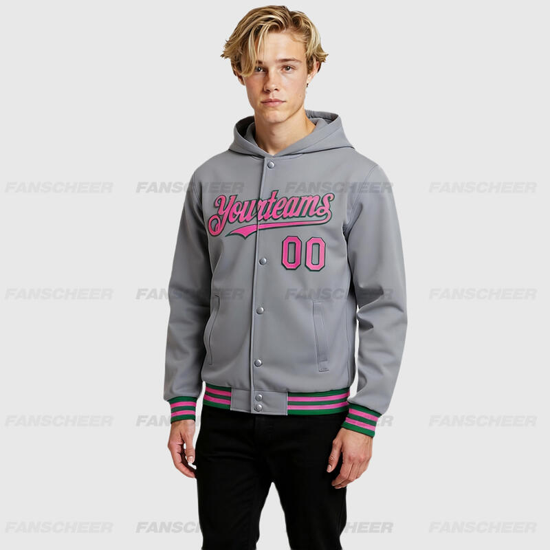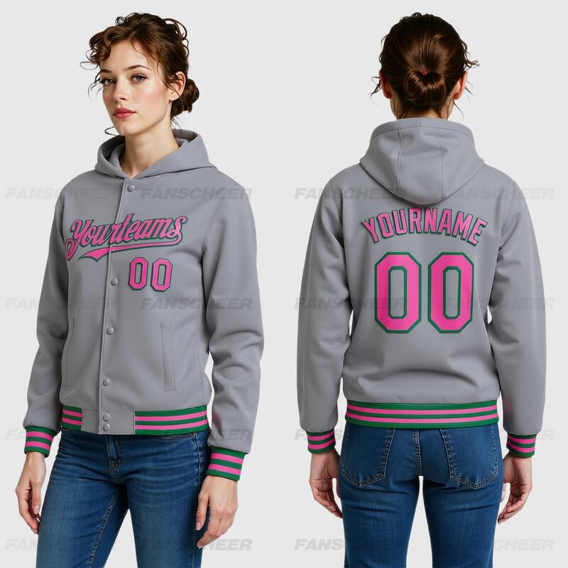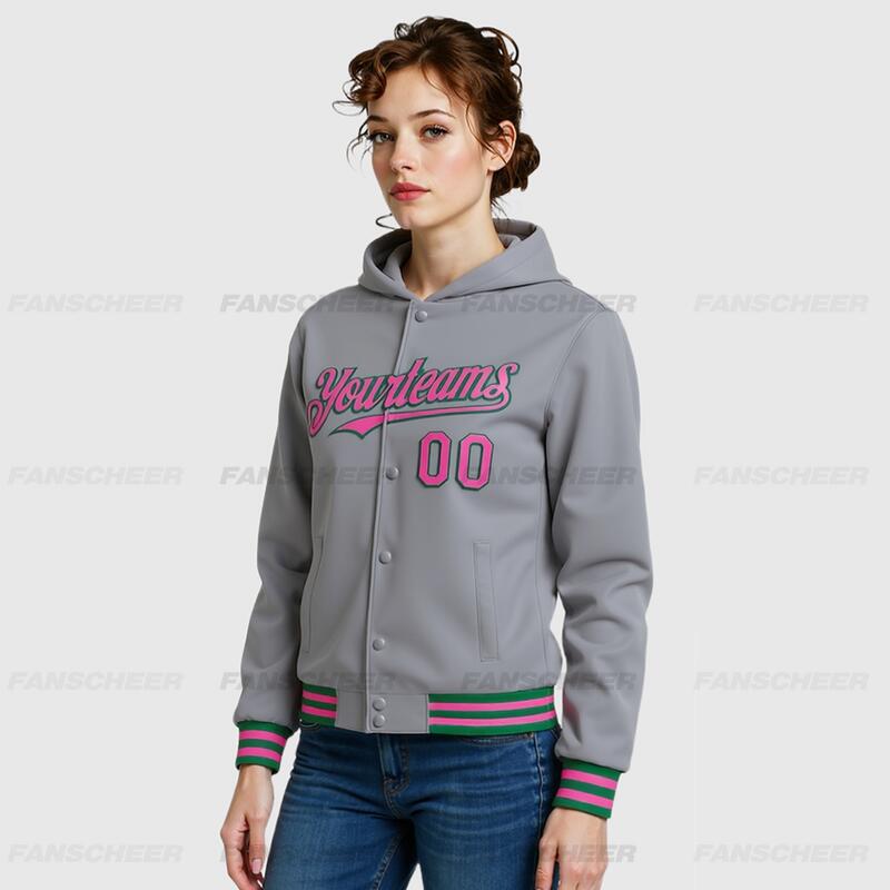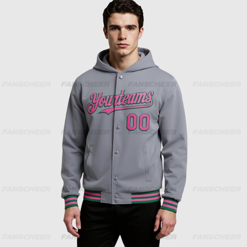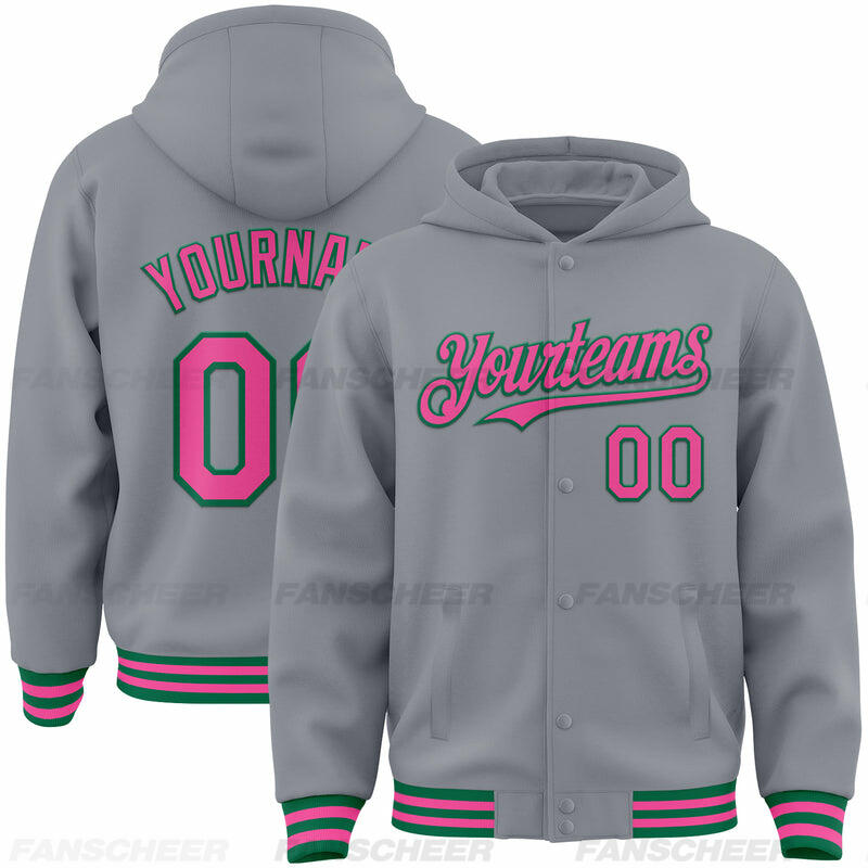 Custom Hoodie Jacket Gray Pink-Kelly Green Bomber Full-Snap Varsity Letterman Hoodie Jacket