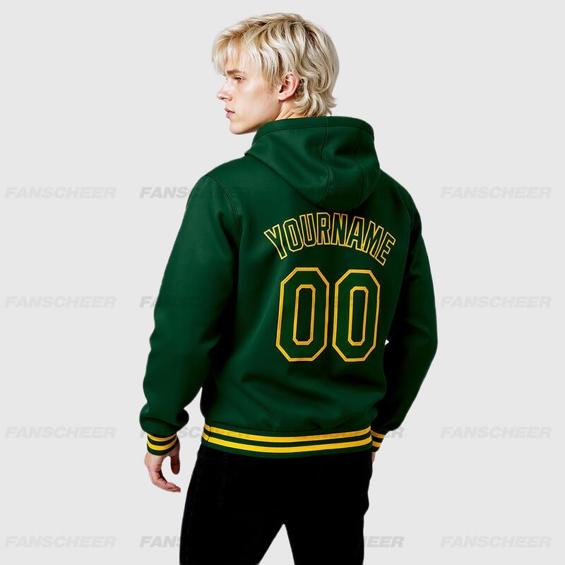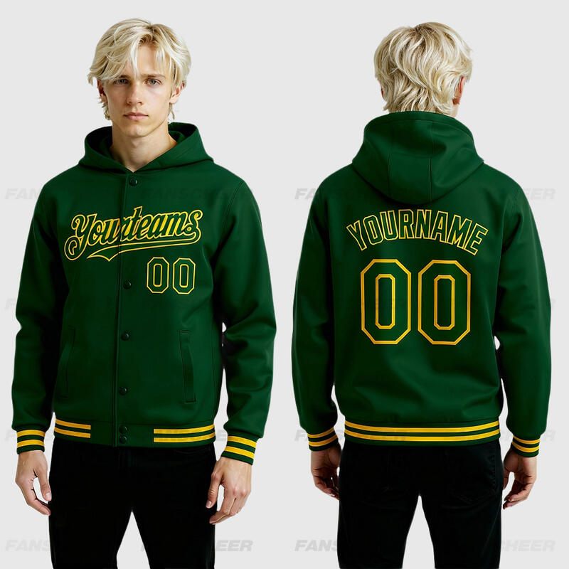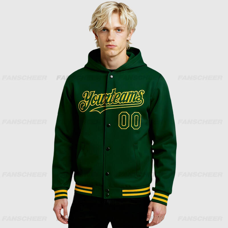 Custom Hoodie Jacket Green Gold Bomber Full-Snap Varsity Letterman Hoodie Jacket