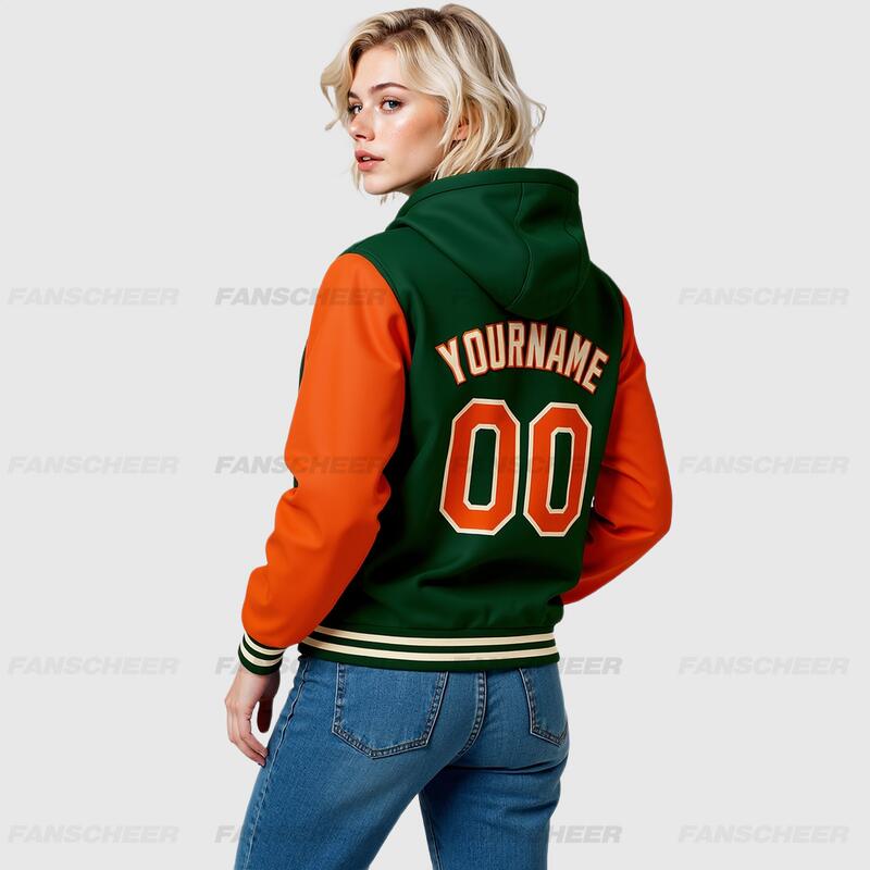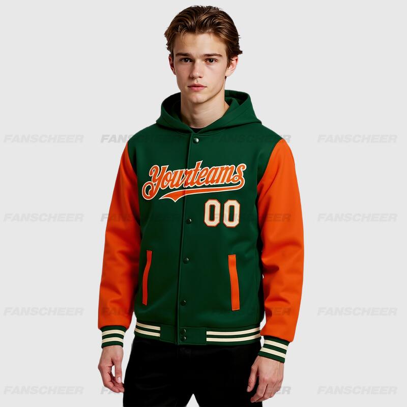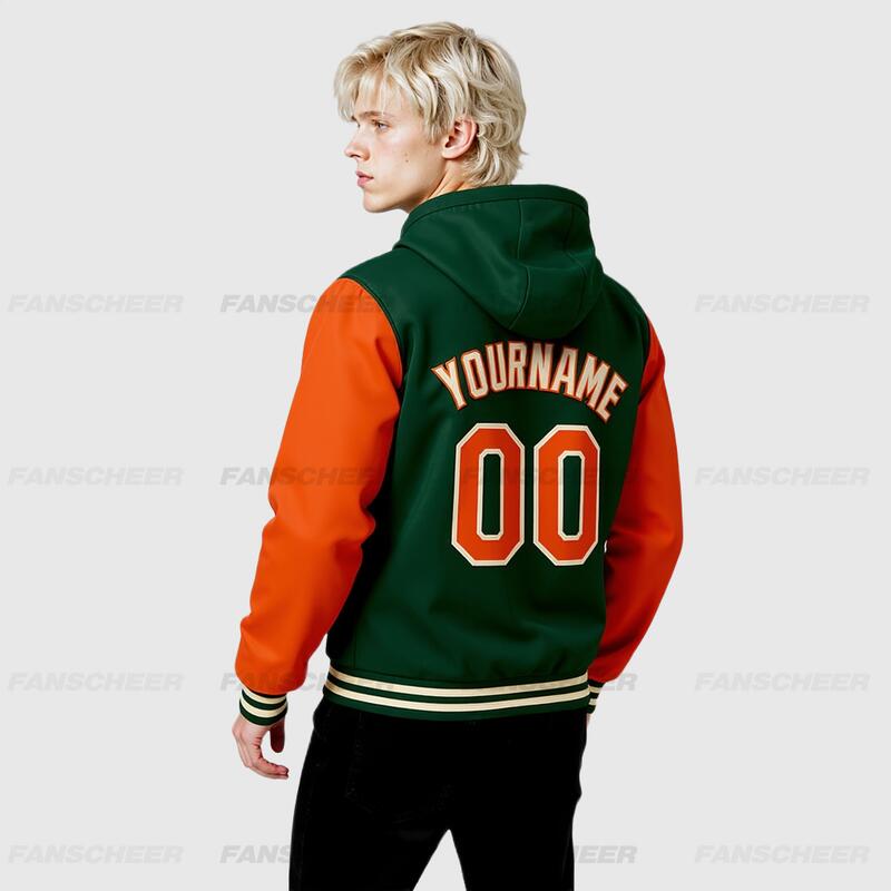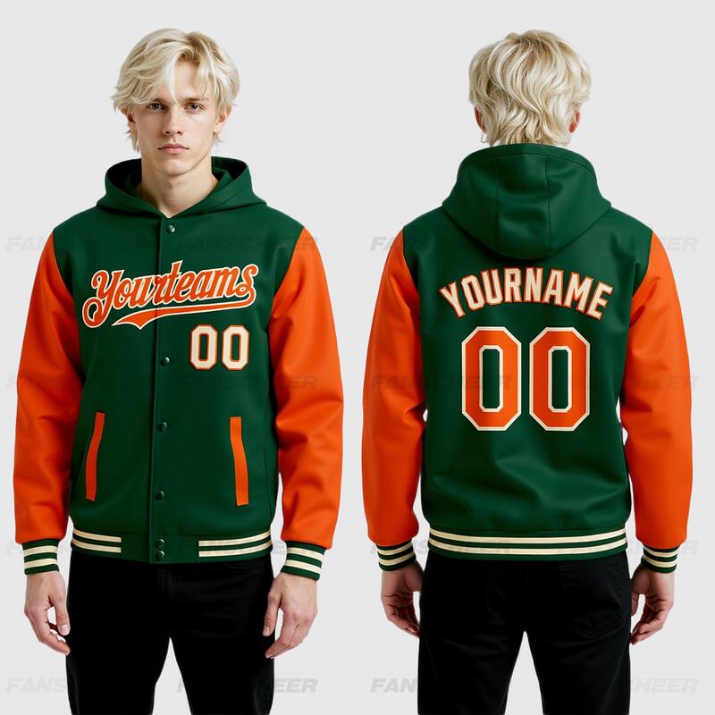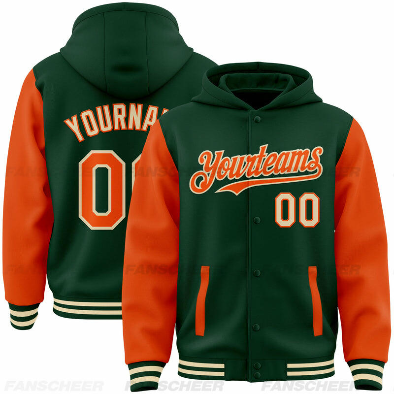 Custom Hoodie Jacket Green Orange-Cream Bomber Full-Snap Varsity Letterman Two Tone Hoodie Jacket