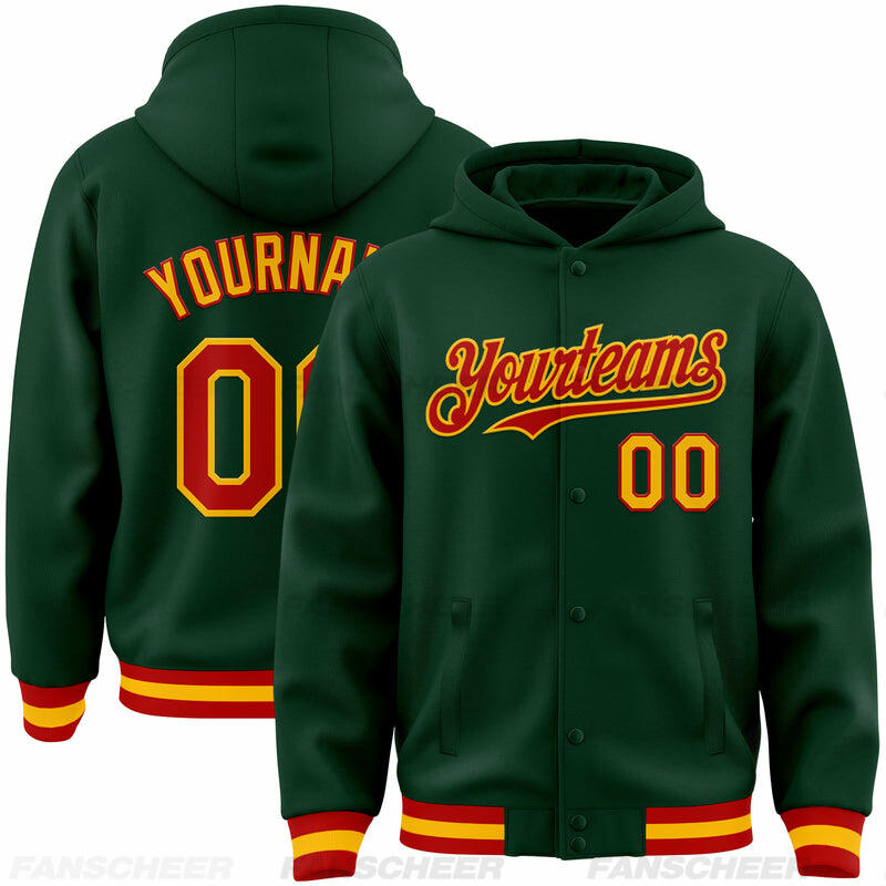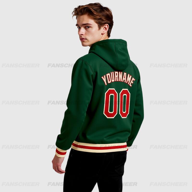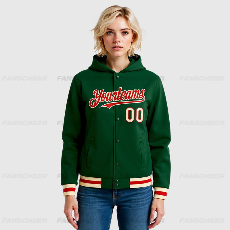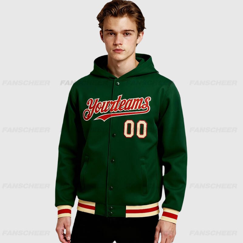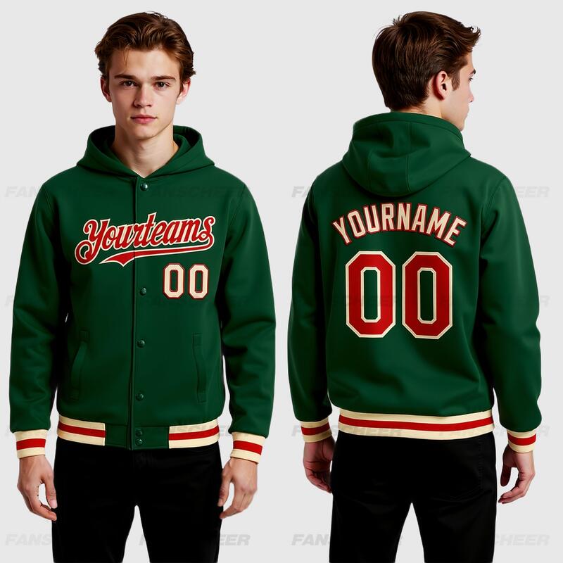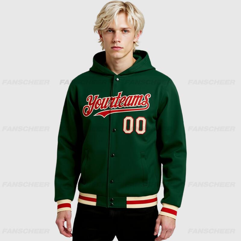 Custom Hoodie Jacket Green Red-Cream Bomber Full-Snap Varsity Letterman Hoodie Jacket