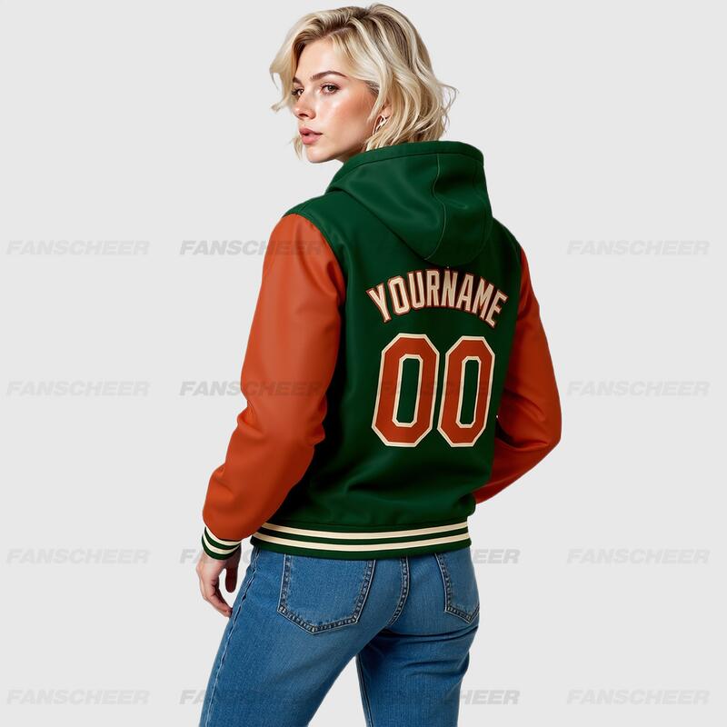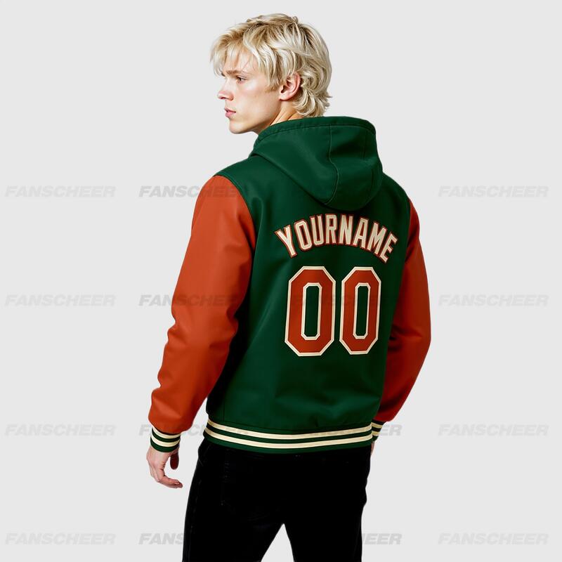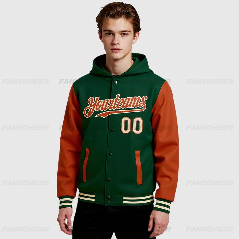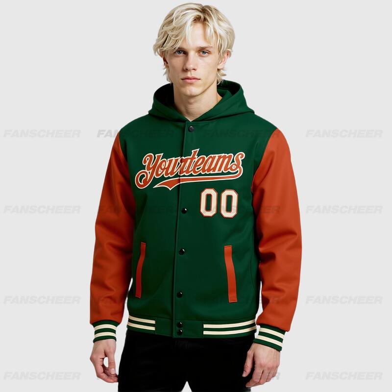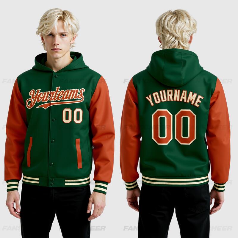 Custom Hoodie Jacket Green Texas Orange-Cream Bomber Full-Snap Varsity Letterman Two Tone Hoodie Jacket