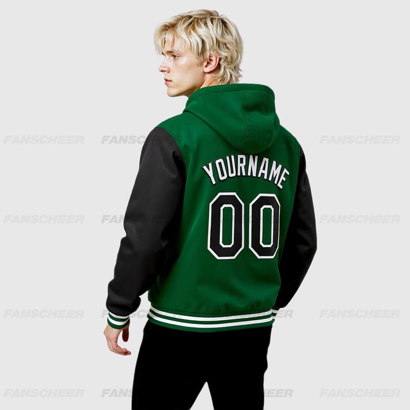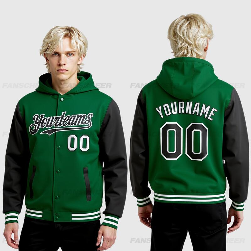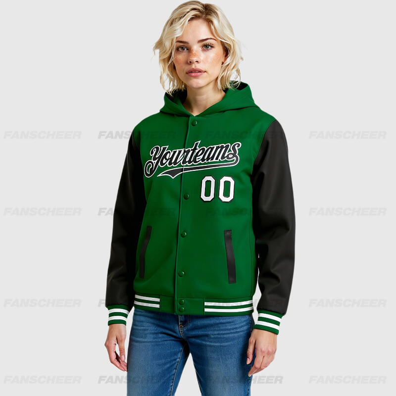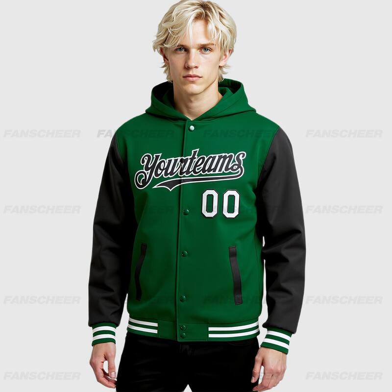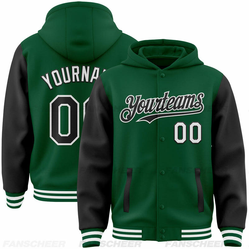 Custom Hoodie Jacket Kelly Green Black-White Bomber Full-Snap Varsity Letterman Two Tone Hoodie Jacket