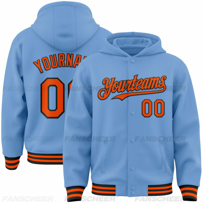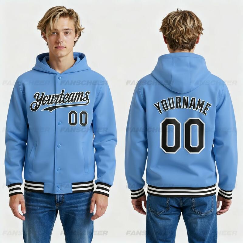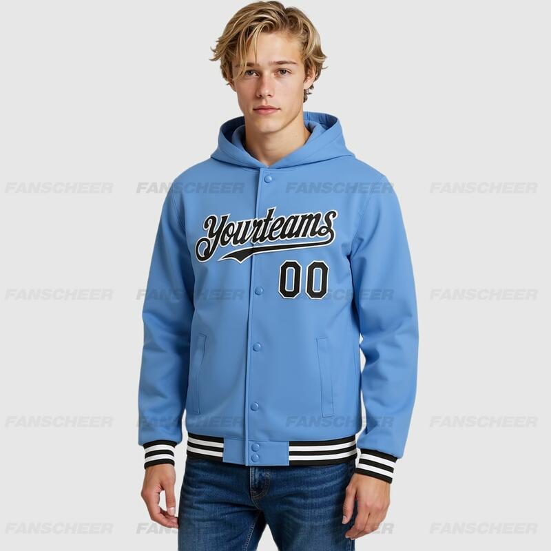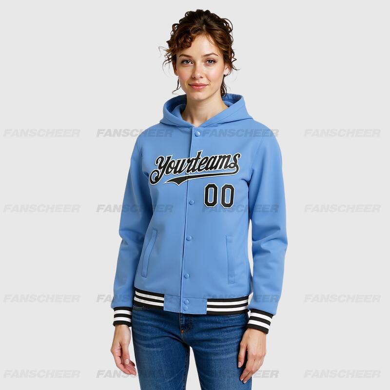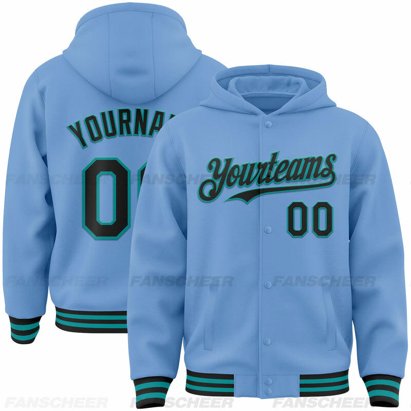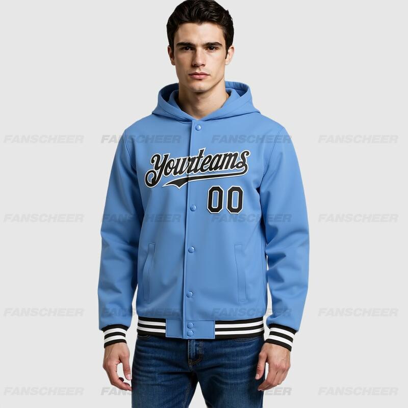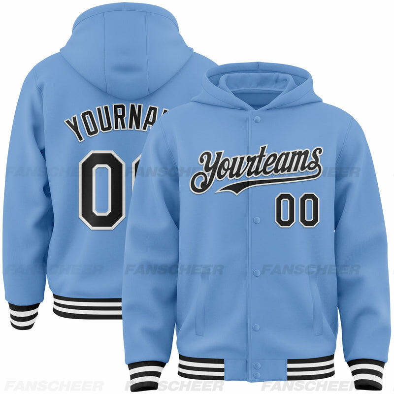 Custom Hoodie Jacket Light Blue Black-White Bomber Full-Snap Varsity Letterman Hoodie Jacket