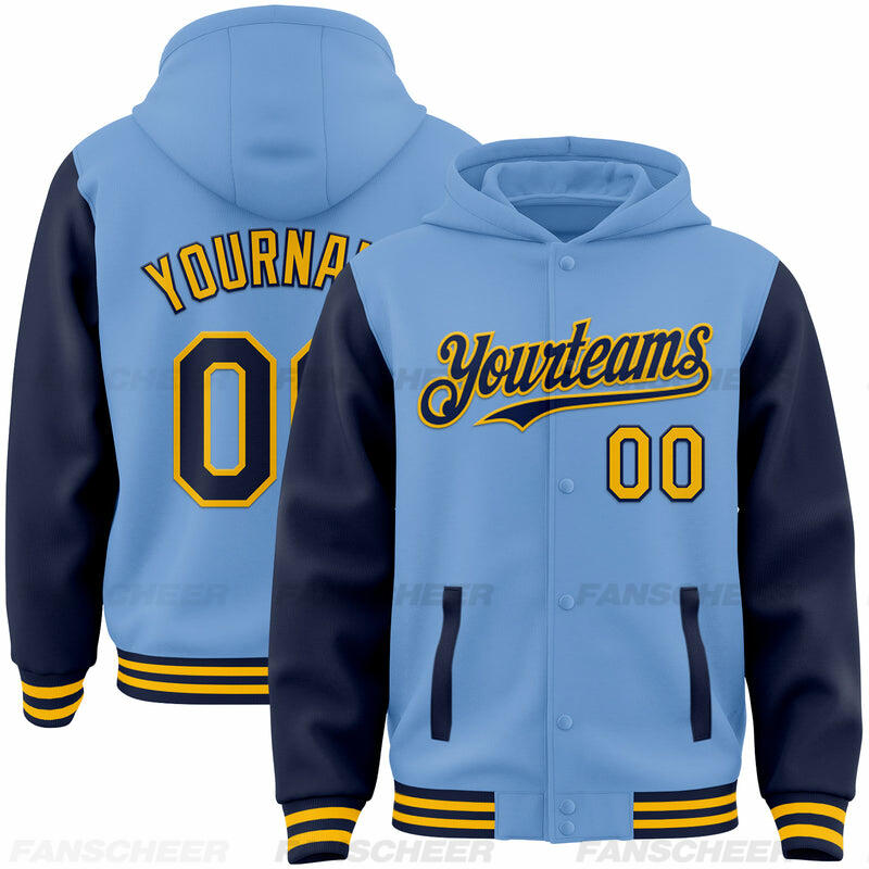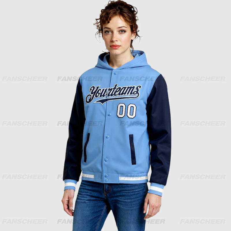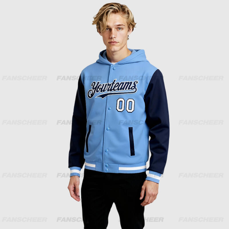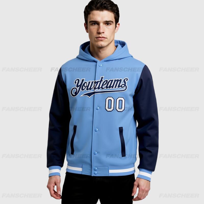 Custom Hoodie Jacket Light Blue Navy-White Bomber Full-Snap Varsity Letterman Two Tone Hoodie Jacket