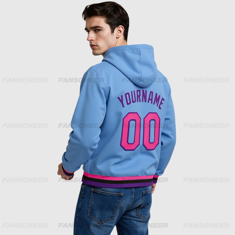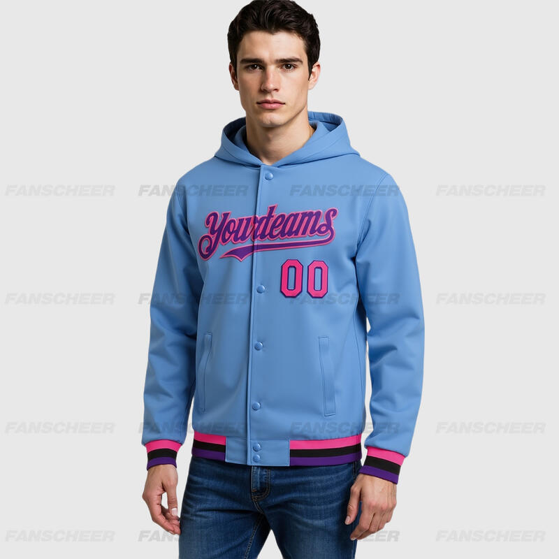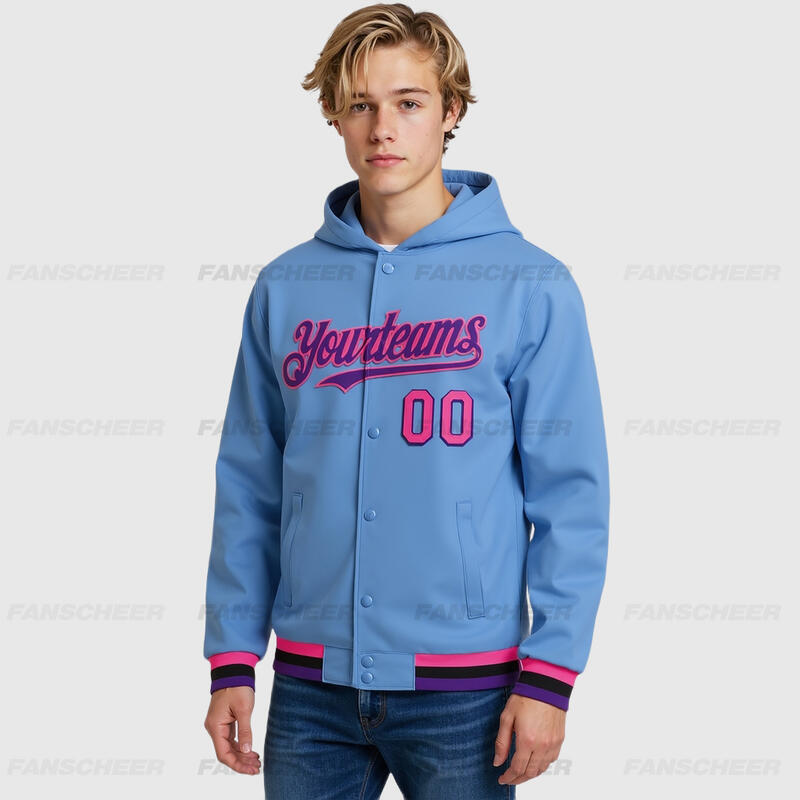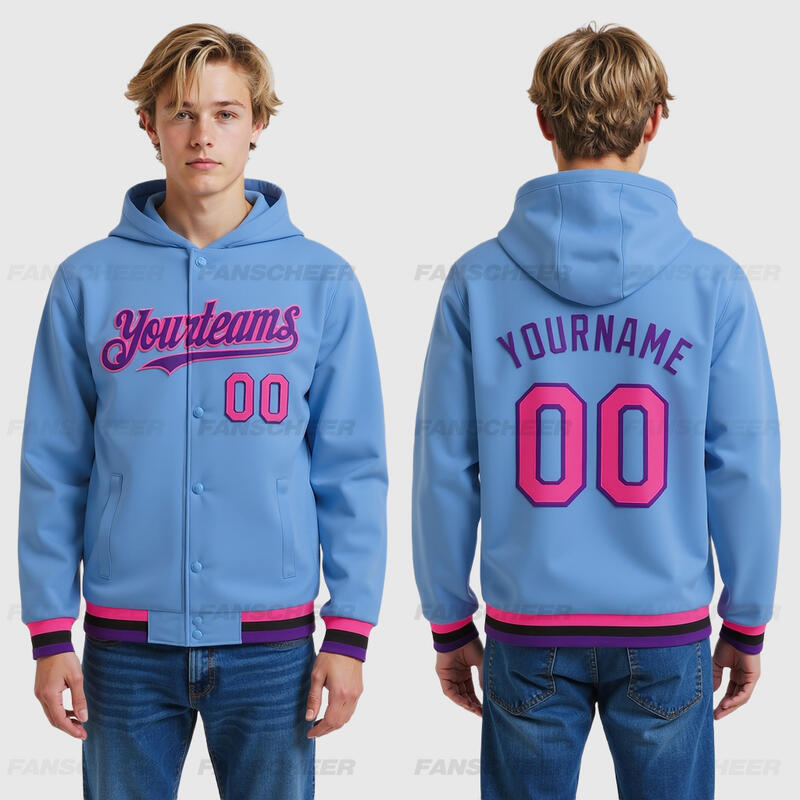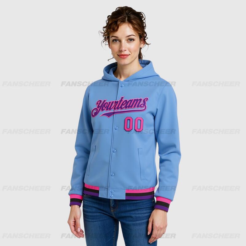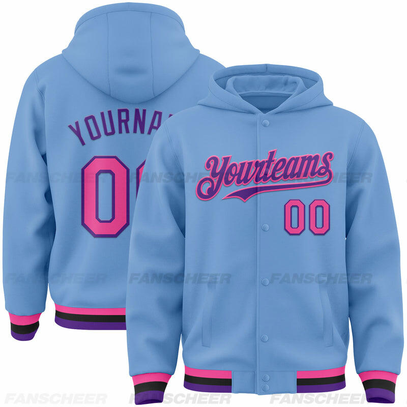 Custom Hoodie Jacket Light Blue Pink Purple-Black Bomber Full-Snap Varsity Letterman Hoodie Jacket
