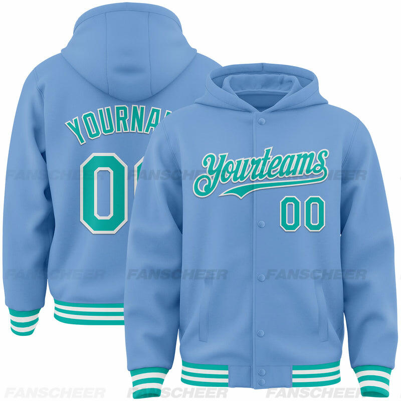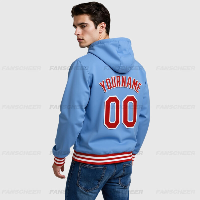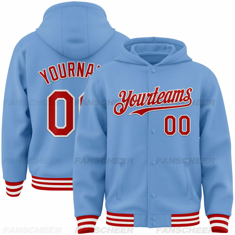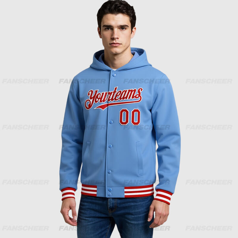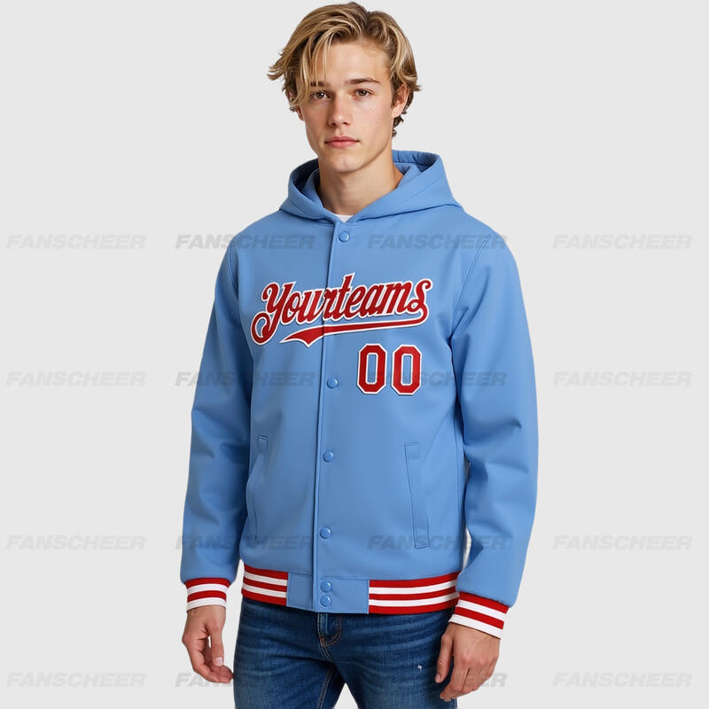 Custom Hoodie Jacket Light Blue Red-White Bomber Full-Snap Varsity Letterman Hoodie Jacket