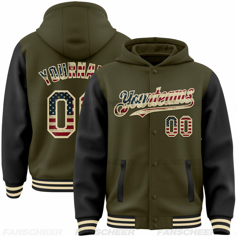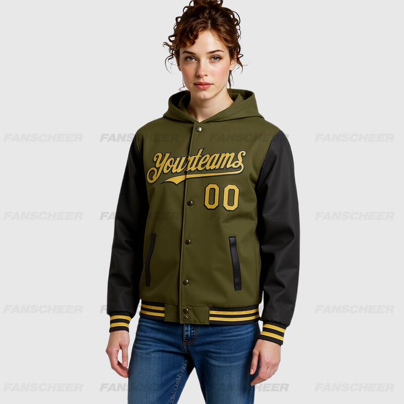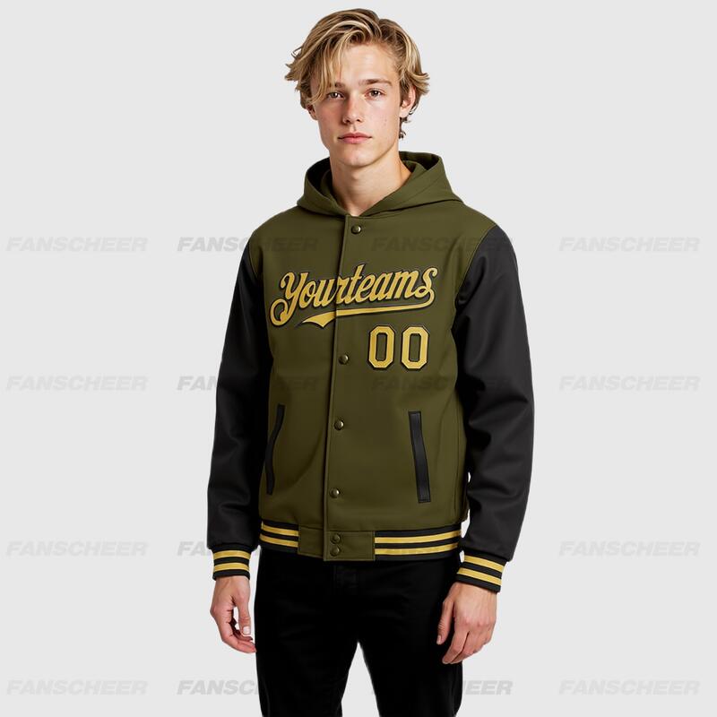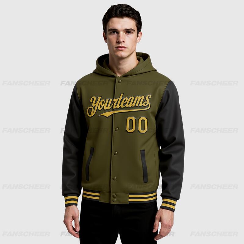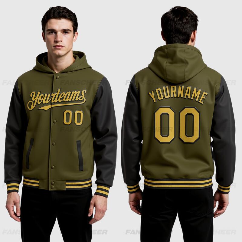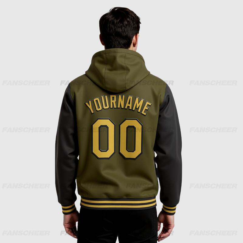 Custom Hoodie Jacket Olive Old Gold-Black Bomber Full-Snap Varsity Letterman Two Tone Salute To Service Hoodie Jacket