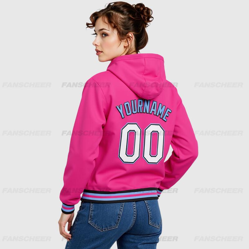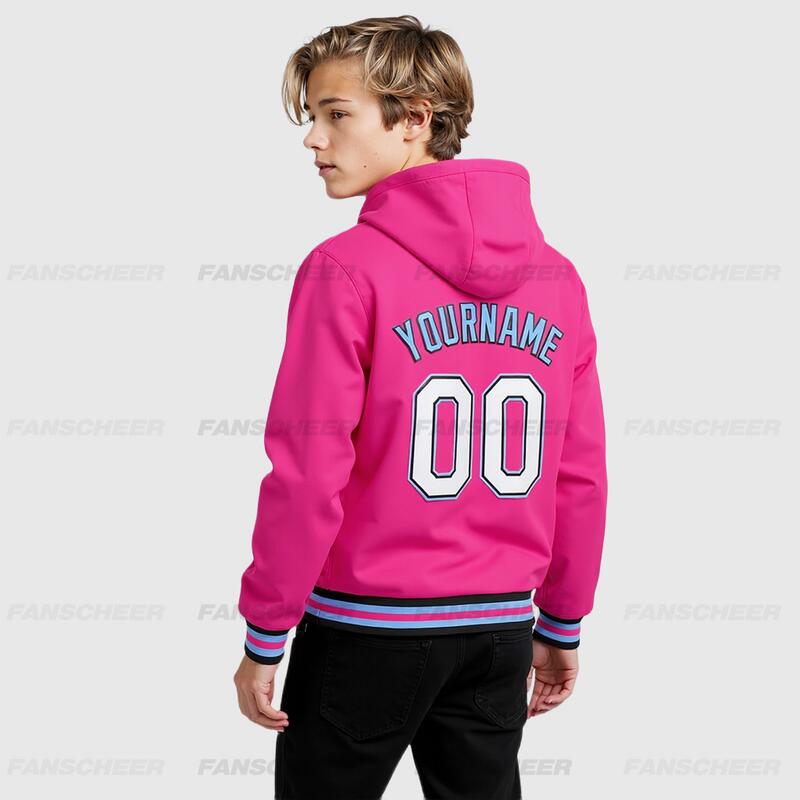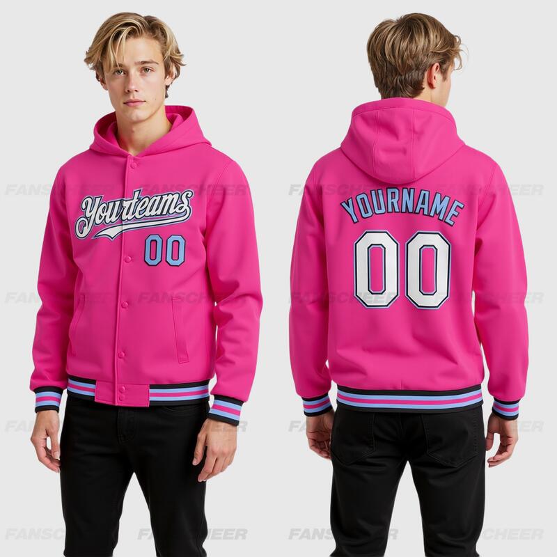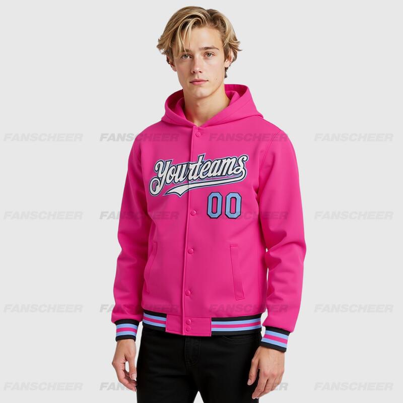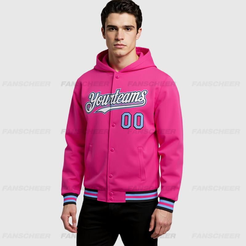 Custom Hoodie Jacket Pink Black-Light Blue Bomber Full-Snap Varsity Letterman Hoodie Jacket