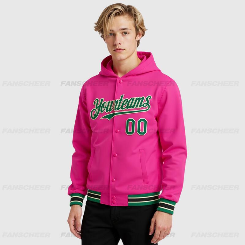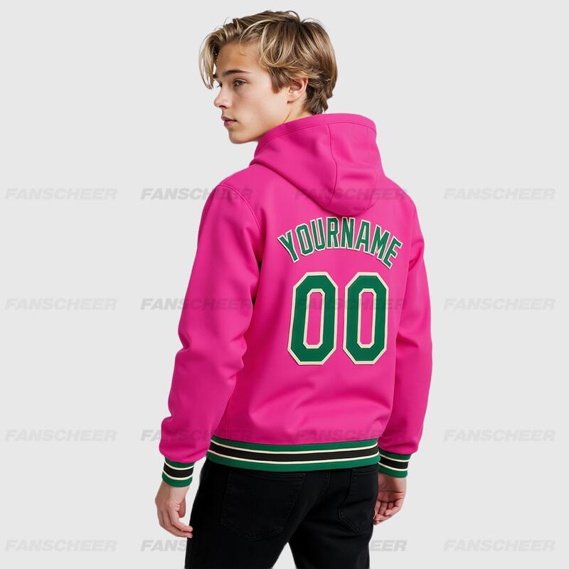 Custom Hoodie Jacket Pink Kelly Green-Cream Bomber Full-Snap Varsity Letterman Hoodie Jacket