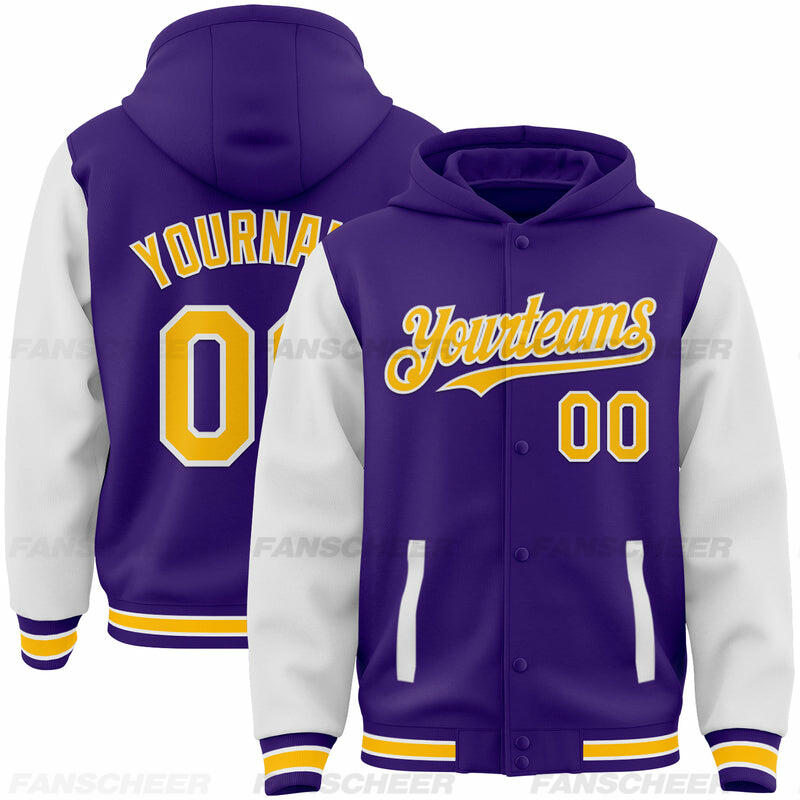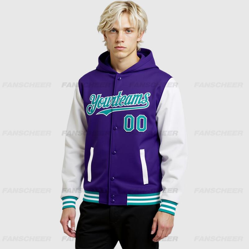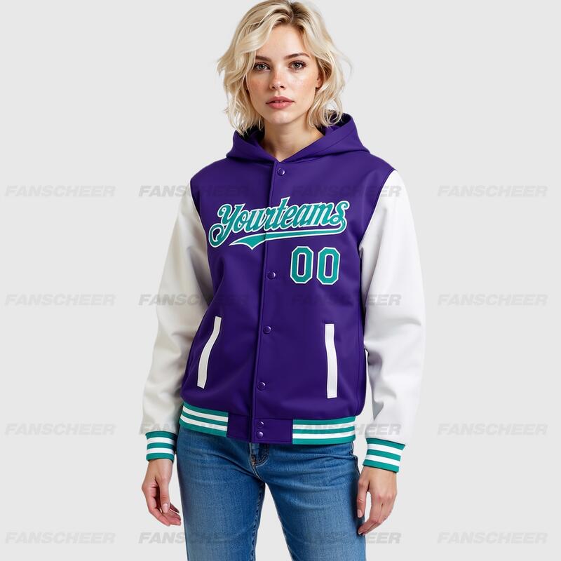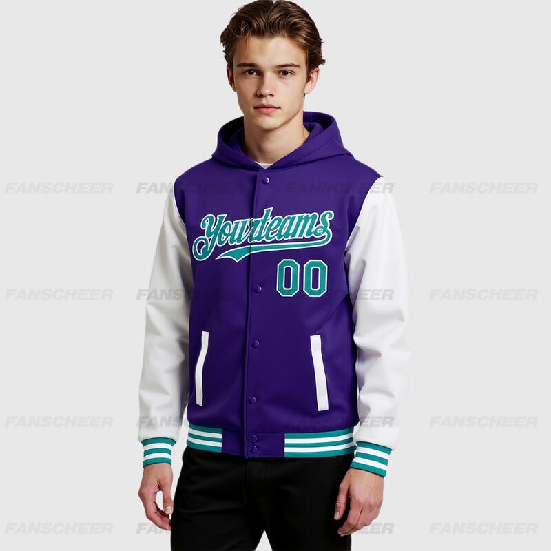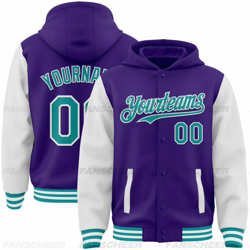 Custom Hoodie Jacket Purple Aqua-White Bomber Full-Snap Varsity Letterman Two Tone Hoodie Jacket