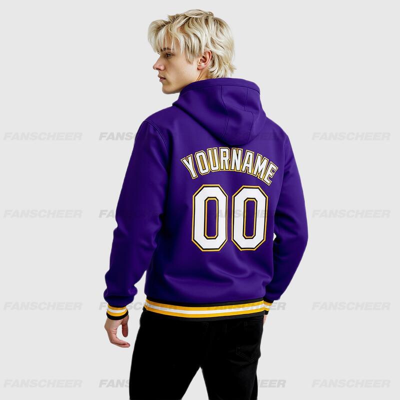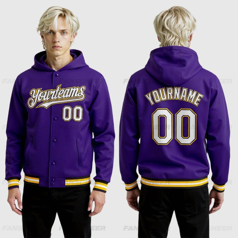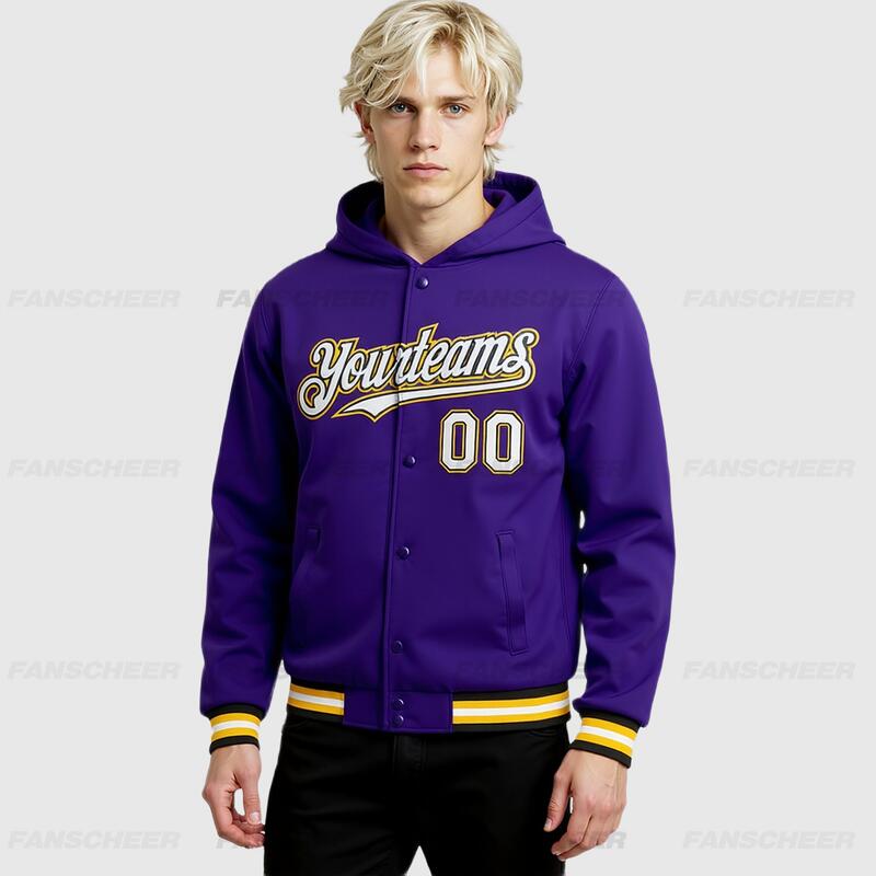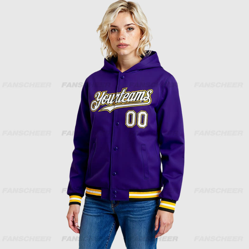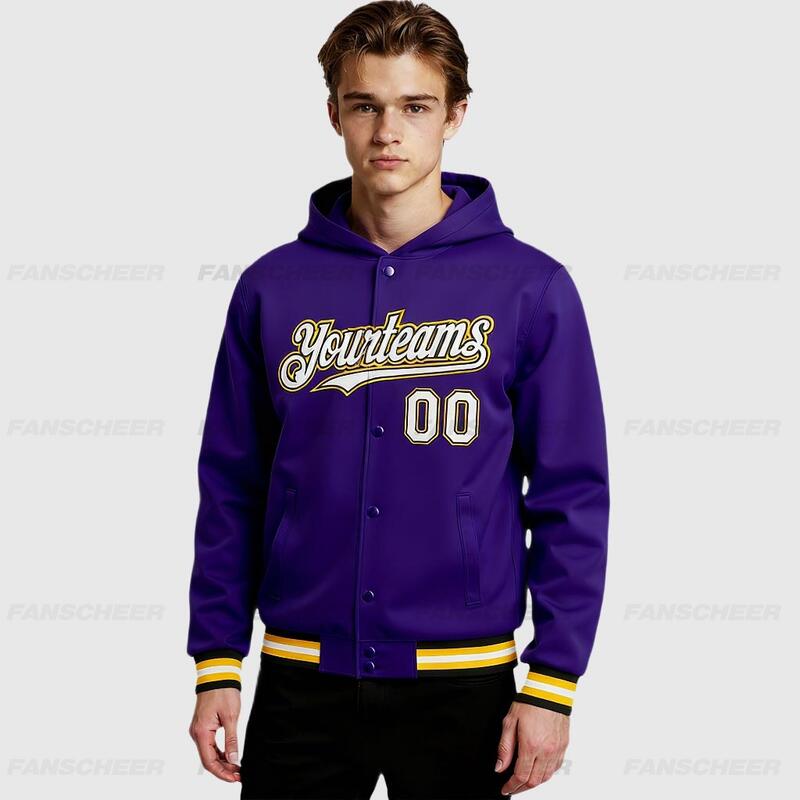 Custom Hoodie Jacket Purple Black-Gold Bomber Full-Snap Varsity Letterman Hoodie Jacket