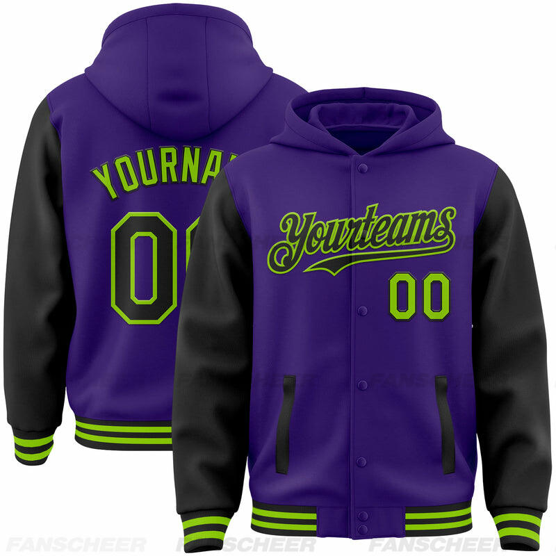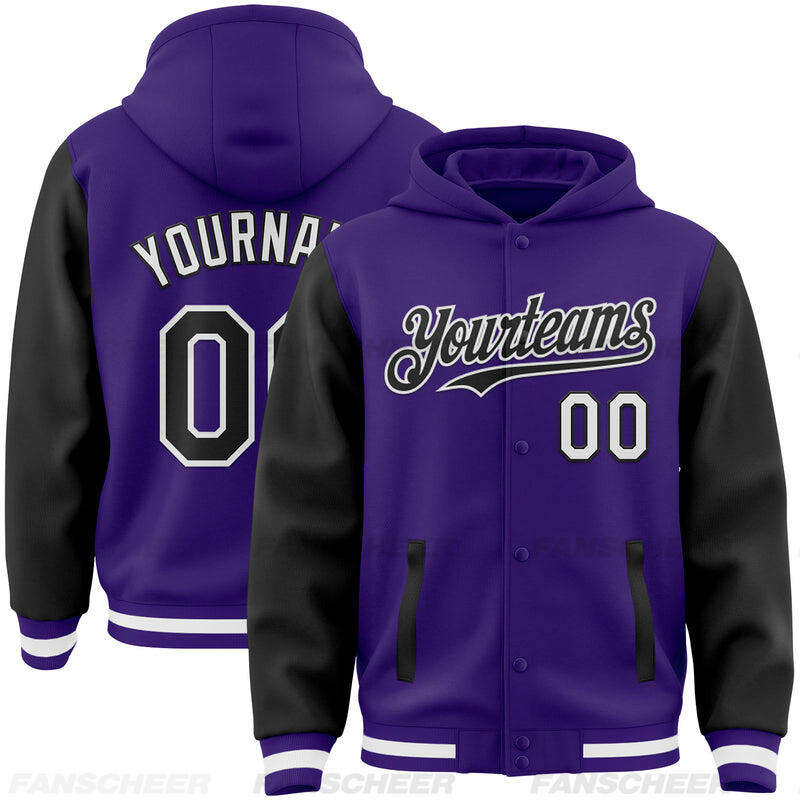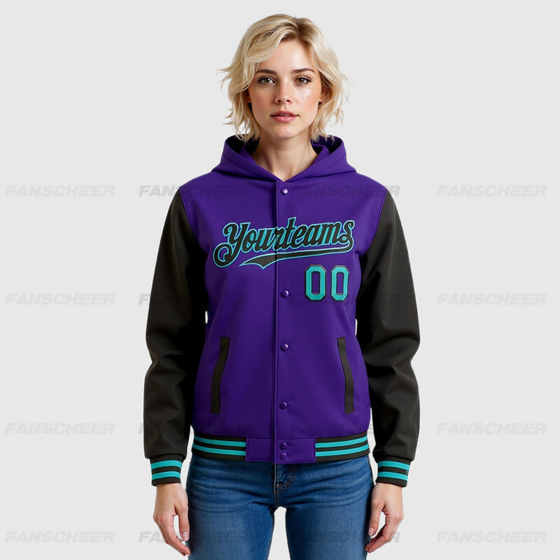 Custom Hoodie Jacket Purple Black-Teal Bomber Full-Snap Varsity Letterman Two Tone Hoodie Jacket