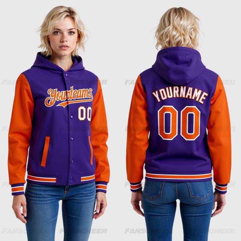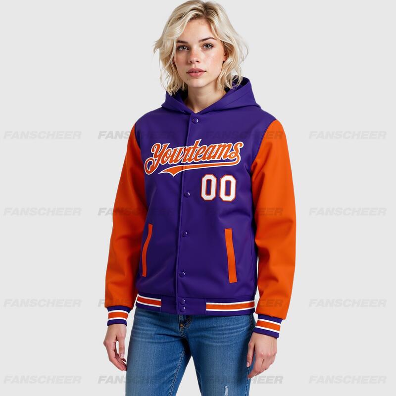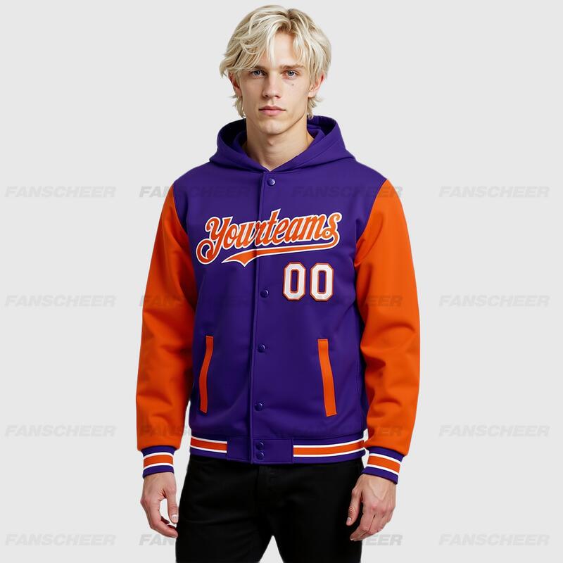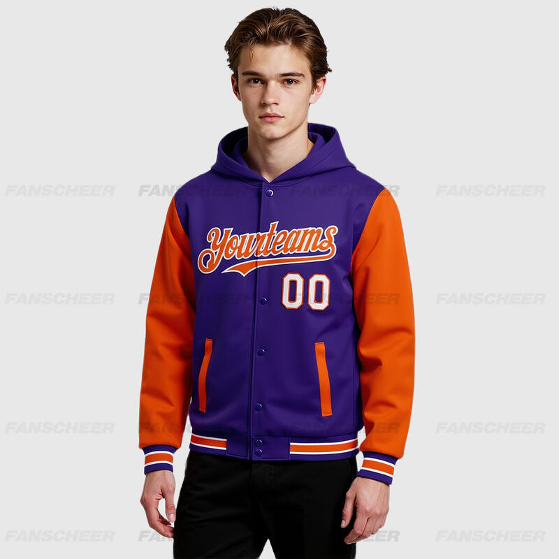 Custom Hoodie Jacket Purple Orange-White Bomber Full-Snap Varsity Letterman Two Tone Hoodie Jacket