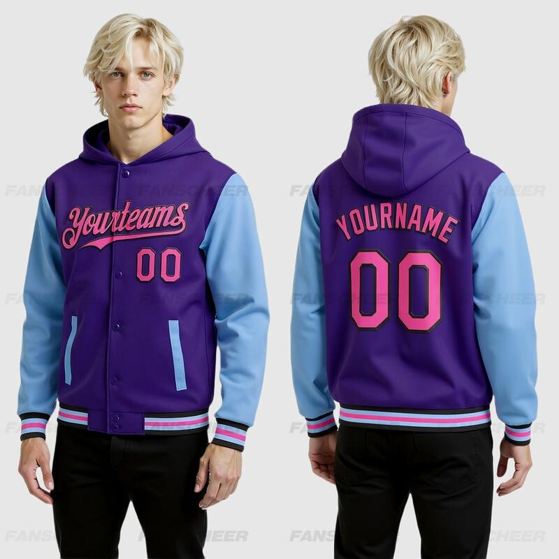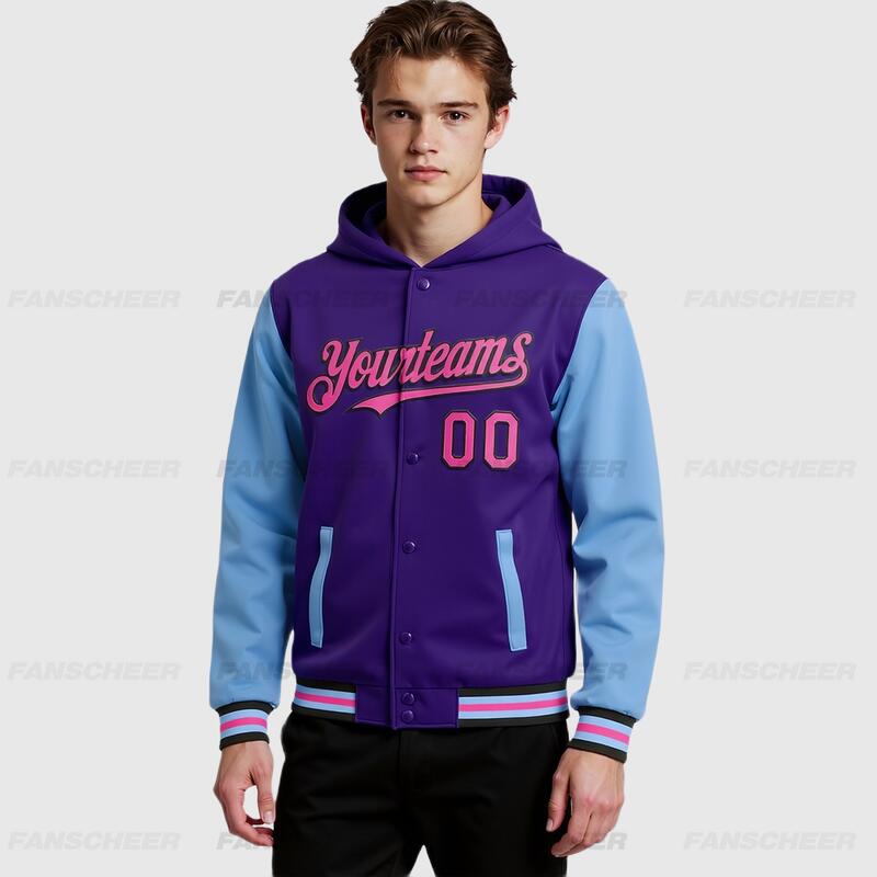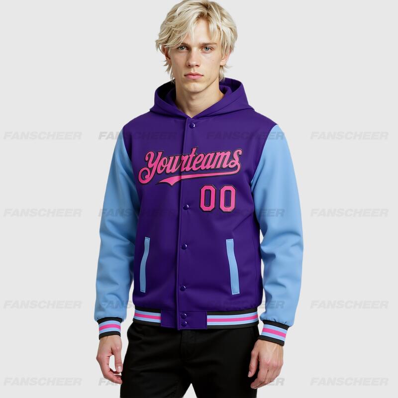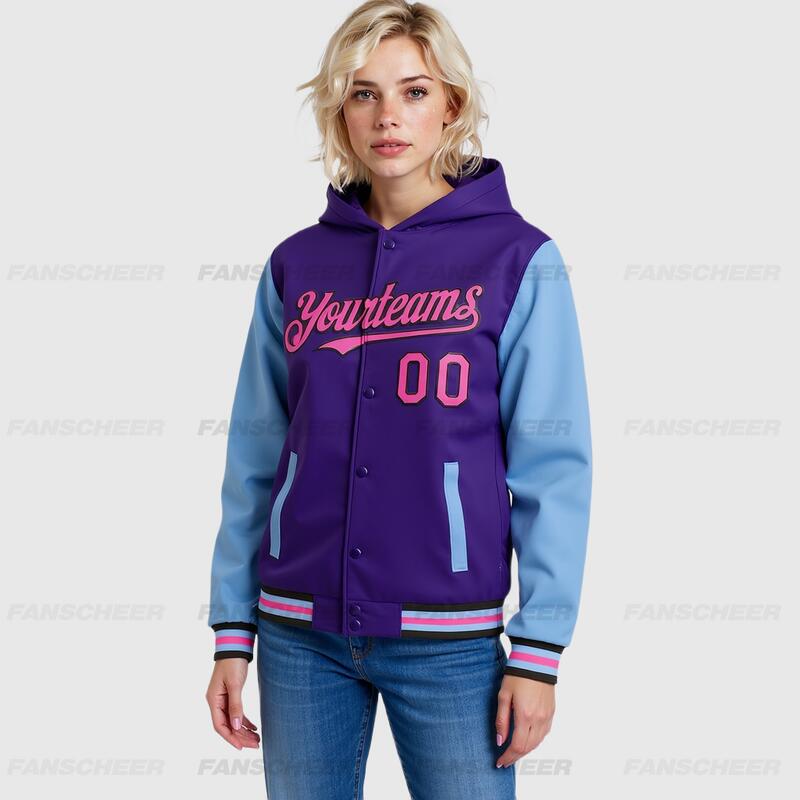 Custom Hoodie Jacket Purple Pink Light Blue-Black Bomber Full-Snap Varsity Letterman Two Tone Hoodie Jacket