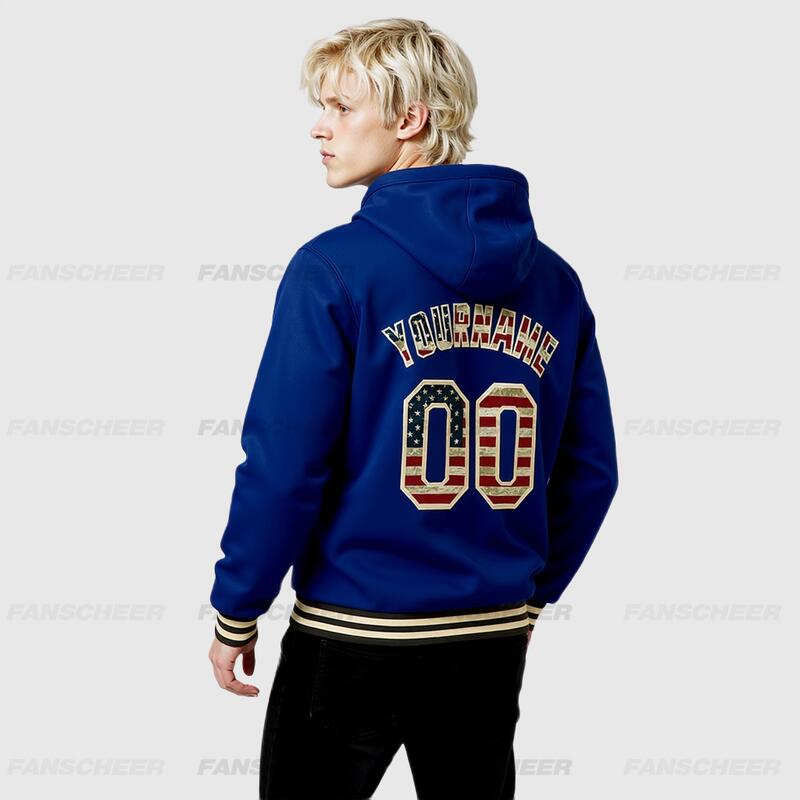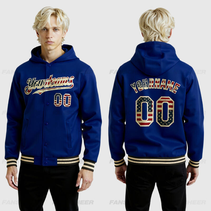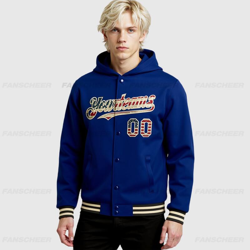 Custom Hoodie Jacket Royal Vintage USA Flag Cream-Black Bomber Full-Snap Varsity Letterman Hoodie Jacket