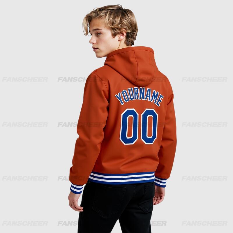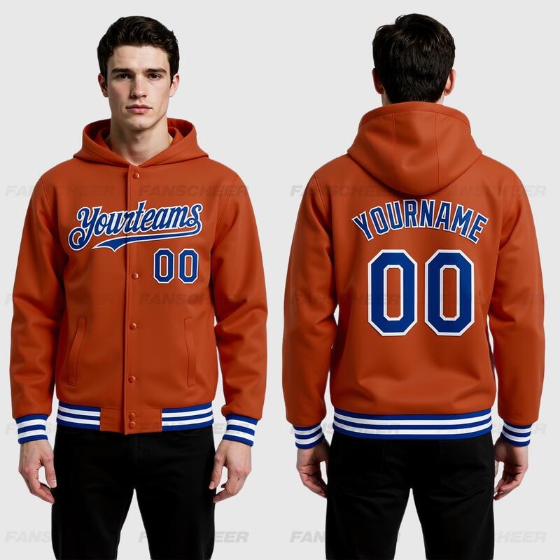 Custom Hoodie Jacket Texas Orange Royal-White Bomber Full-Snap Varsity Letterman Hoodie Jacket
