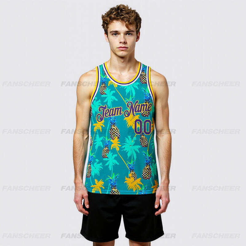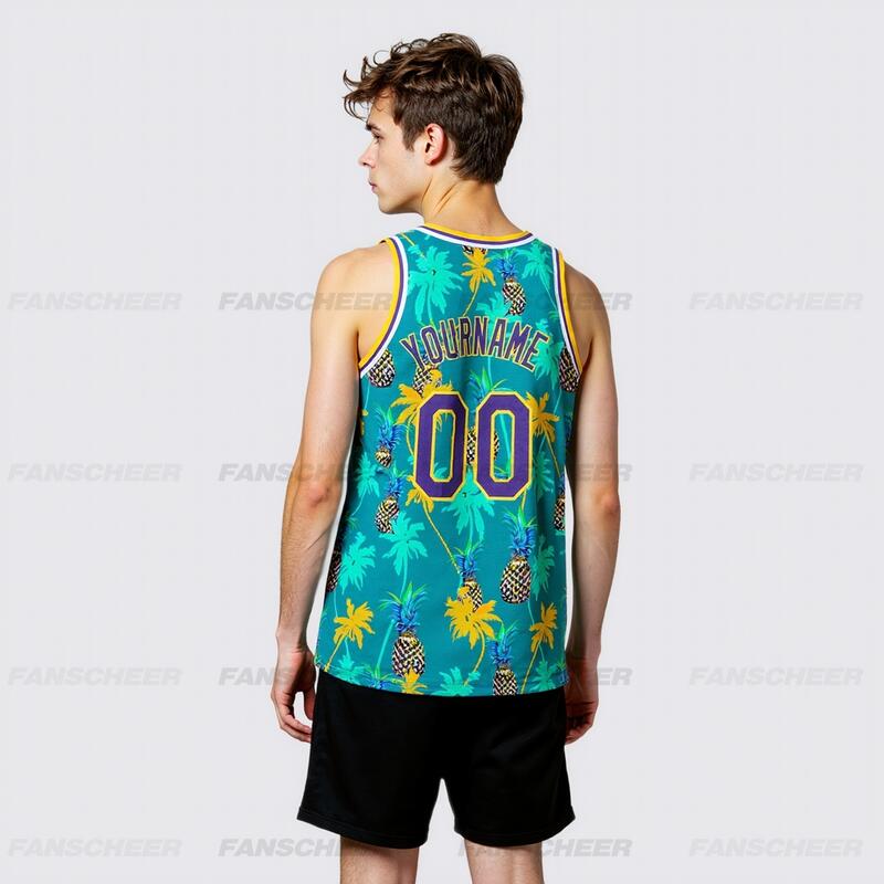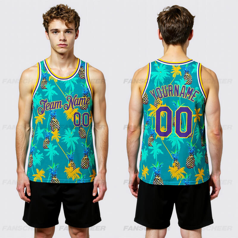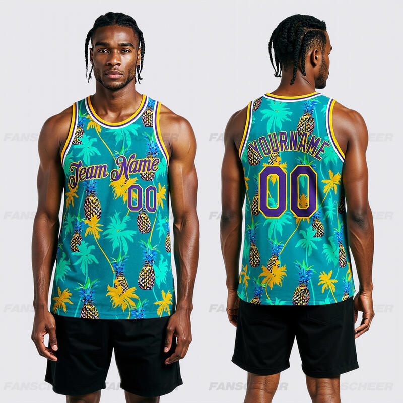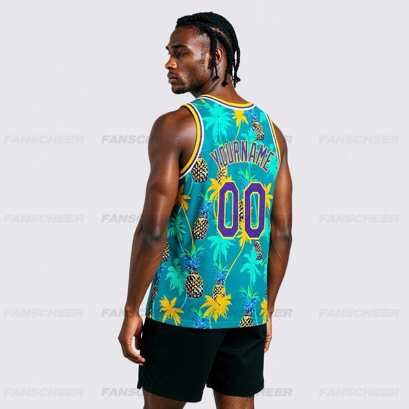 Custom Kelly Green Purple-Gold 3D Pattern Hawaii Palm Trees Pineapples Authentic Basketball Jersey