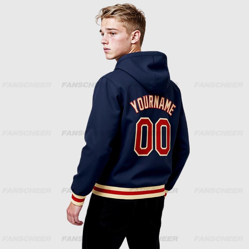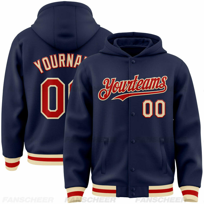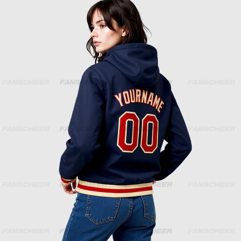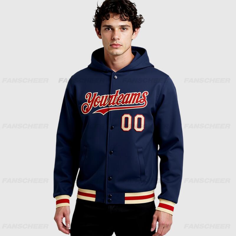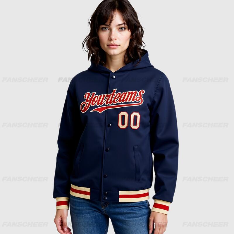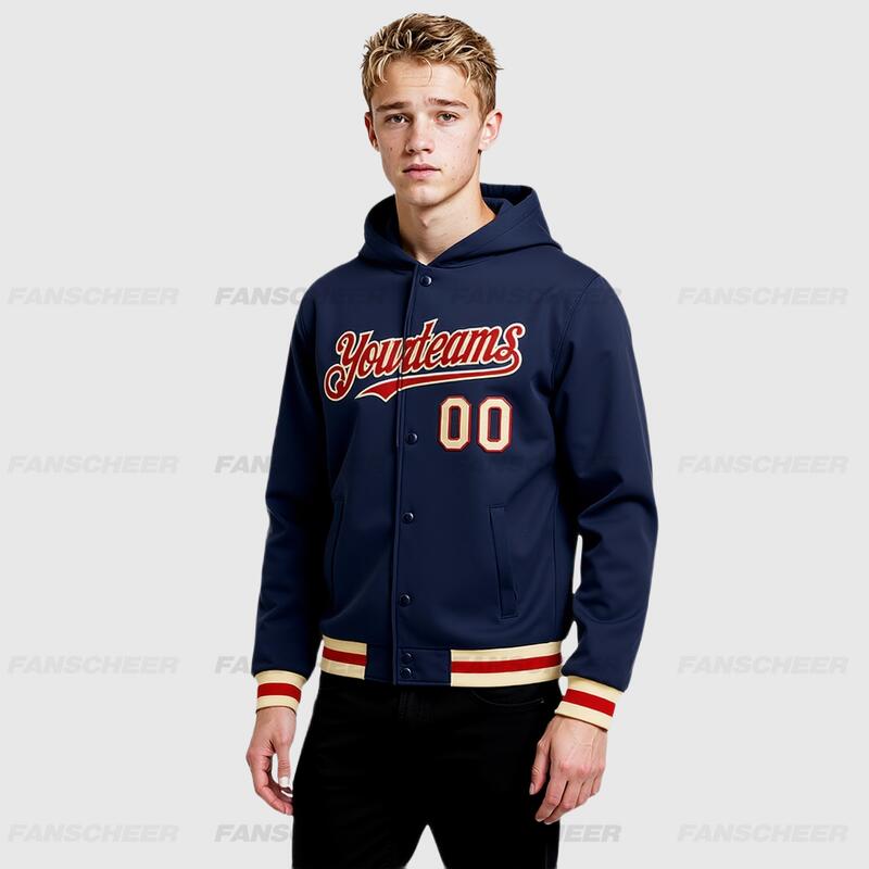 Custom Navy Full-Snap Varsity Letterman Hoodie Jacket for Coffee Dates