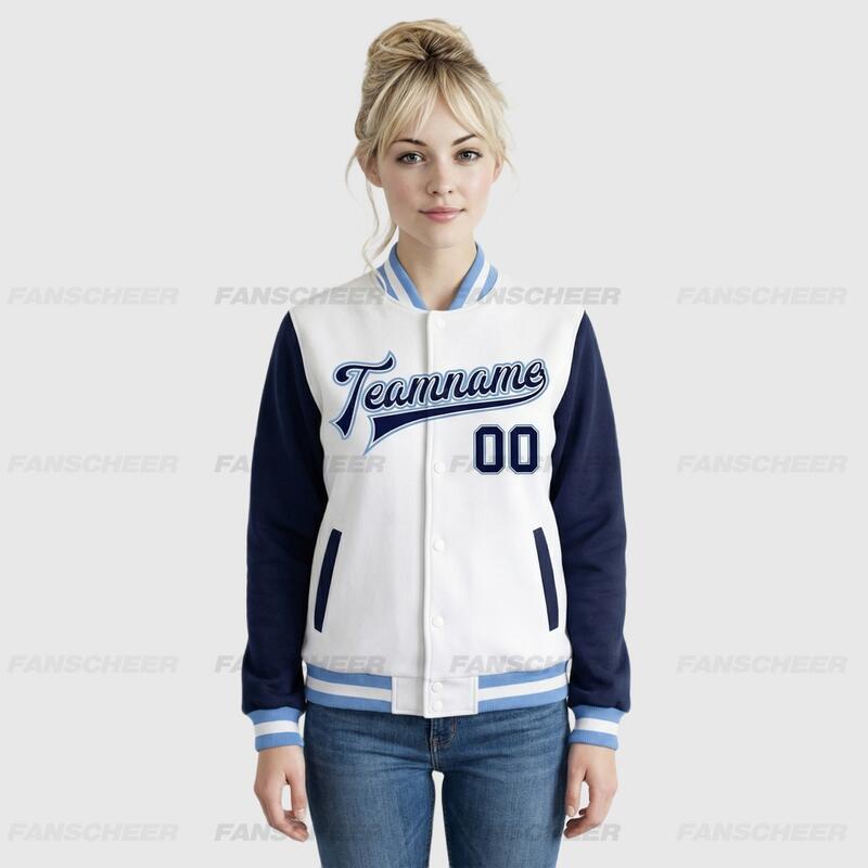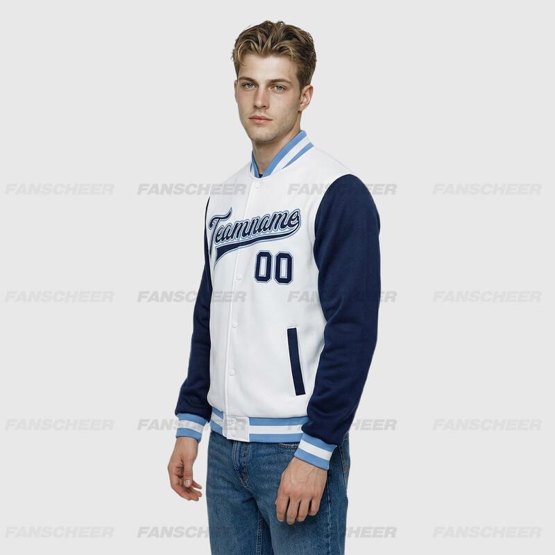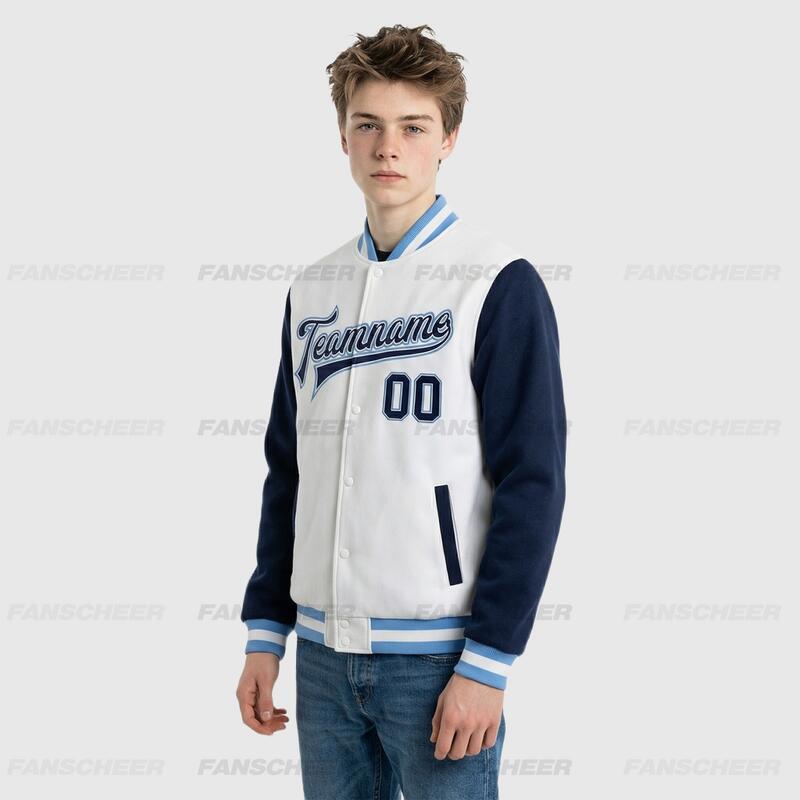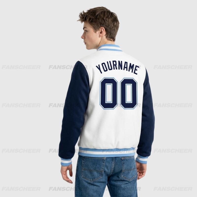 Custom Navy-White Two Tone Full-Snap Letterman Jacket – Ideal for Weekend Urban Strolls and Park Hangouts