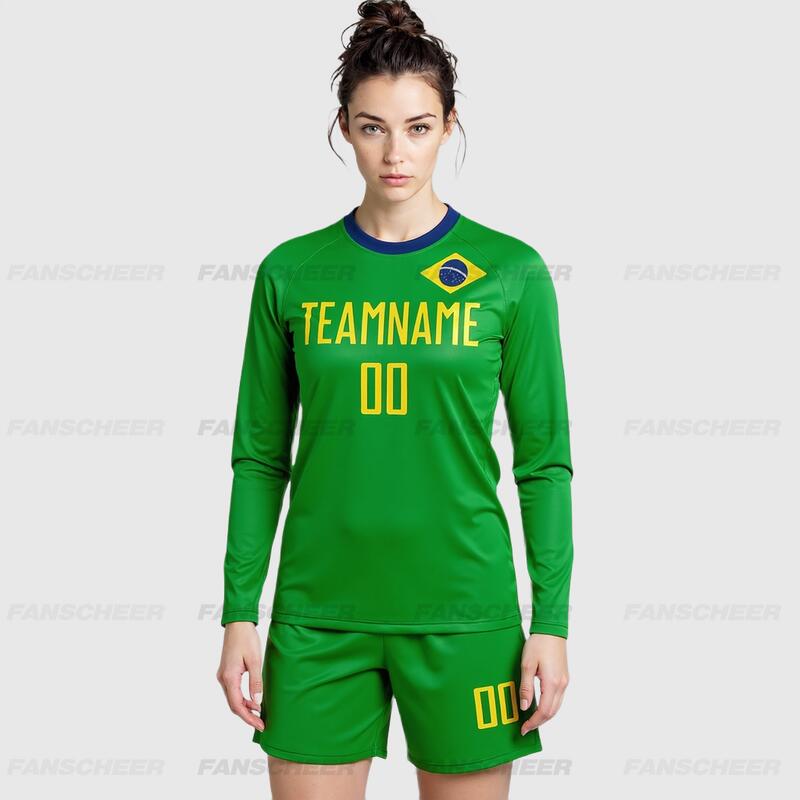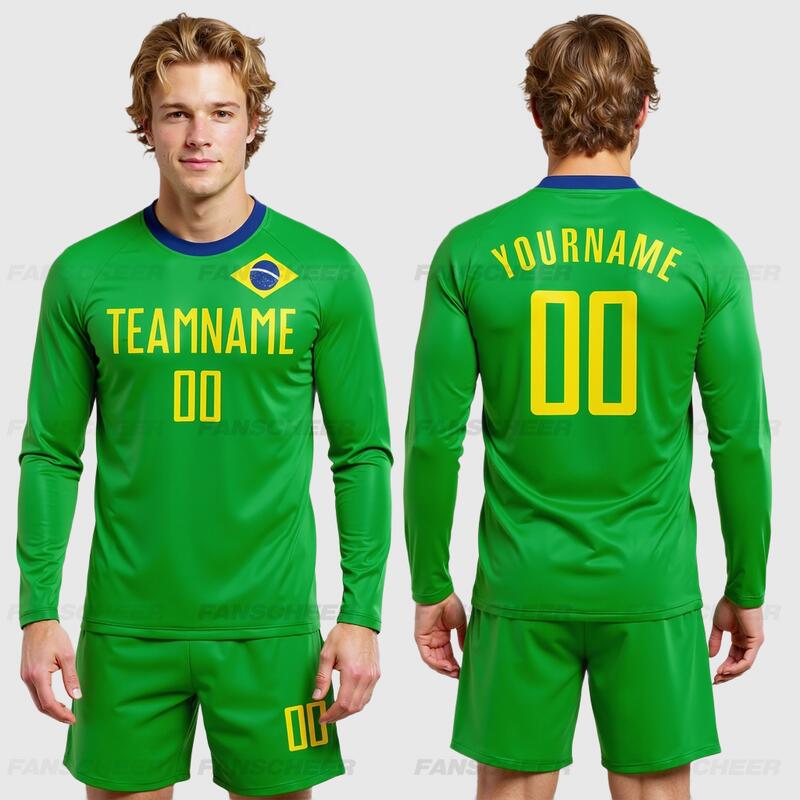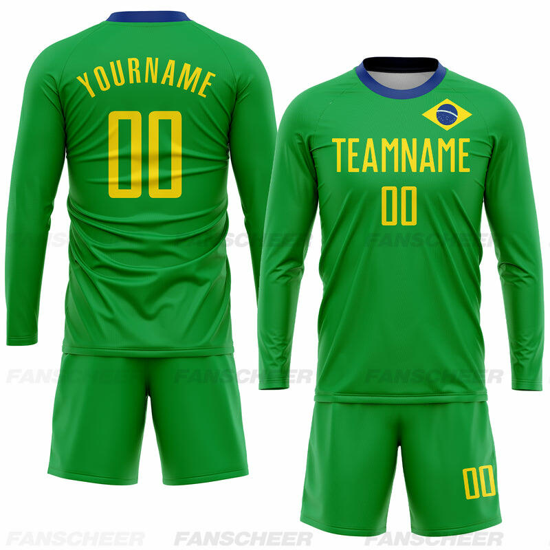 Custom Neon Green Gold-Royal Sublimation Brazilian Flag Soccer Uniform Jersey Long Sleeve