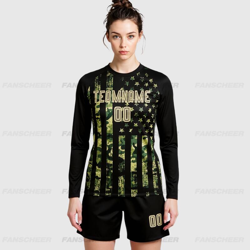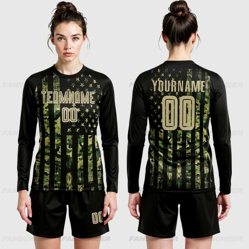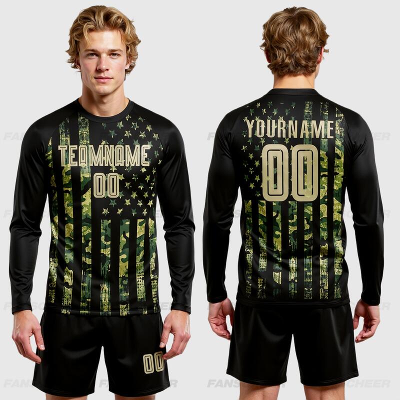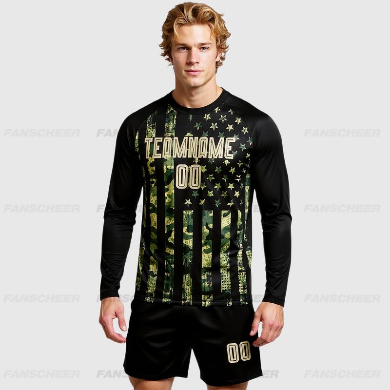 Custom Soccer Uniform Jersey Camo Vegas Gold-Black American Flag Fashion Long Sleeve Sublimation Salute To Service